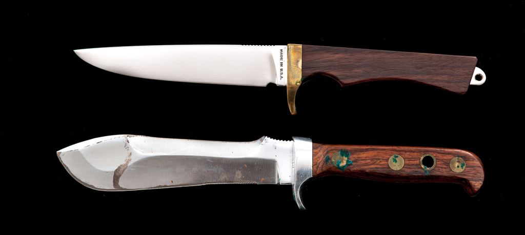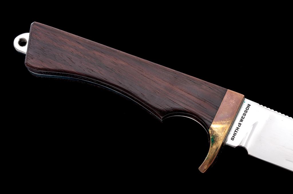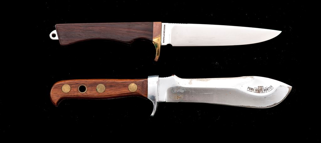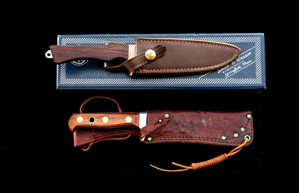 Lot of Two (2) Fixed Blade Knives, by Puma and Smith & Wesson: 1.) Puma White Hunter, made in 1973, 6'' blade, 10.5'' overall, wood handles, with the original leather sheath. Condition is good. Blade shows additional sharpening and use. Wood shows only light handling marks with spots of verdigris on the brass. Sheath shows age and wear consistent with the overall knife condition. 2.) Smith & Wesson Model 6050 Fisherman knife, 5.5'' blade, 10.5'' overall, brass guard, smooth wood handles. With original sheath, box, and misc. paperwork. Condition is excellent, knife and sheath appear unused. Brass guard with moderate toning. Brass snaps on the sheath with some verdigris. Box is in very good condition but does have some writing in black marker on lid and end panel. Est.: $200-$300/lot.