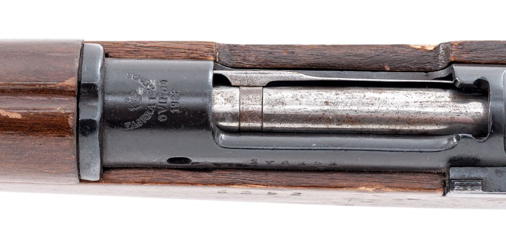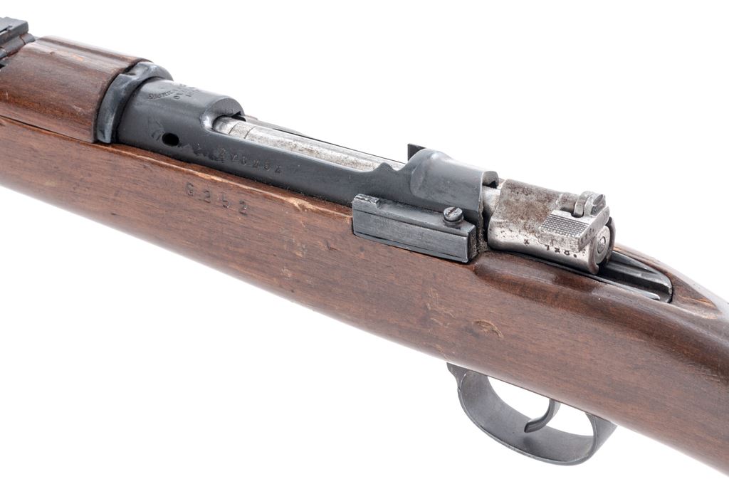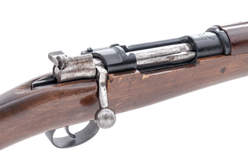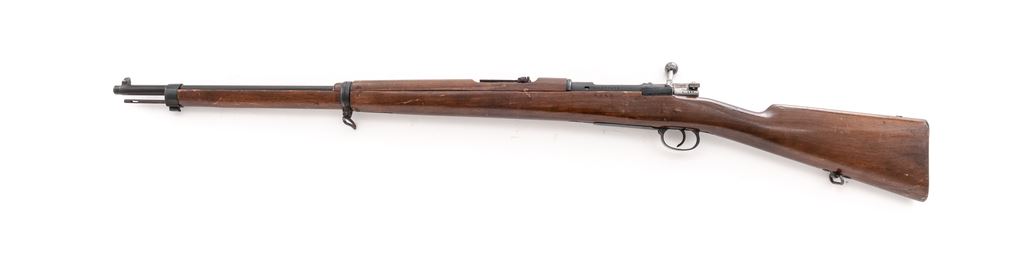 Sporterized Model 1893 Spanish Mauser Bolt Action Rifle, #2V6252, 7x57mm cal., 29.06'' barrel, blued/bright finish, hardwood stock, cleaning rod, blade front sight and adjustable folding leaf rear sight. Marked on receiver ring with Spanish crown over ''FABRICA DE ARMAS 1928''. Matching number on stock and other parts, mismatched number on cocking piece. Rifle has been sporterized by replacing bolt handle with a turned-down commercial replacement. Right side of stock has a slot cut for the new bolt handle. Condition overall is very good with approx. 85% finish remaining on the metal, with scattered rust spots on the bands and bolt. Wood has been refinished with a dark brown gloss varnish and shows overall handling marks. Action is smooth, bore is dark with roughness forward of the chamber with very good rifling. Import stamped on left side of barrel. Est.: $250-$400. (C&R)