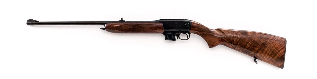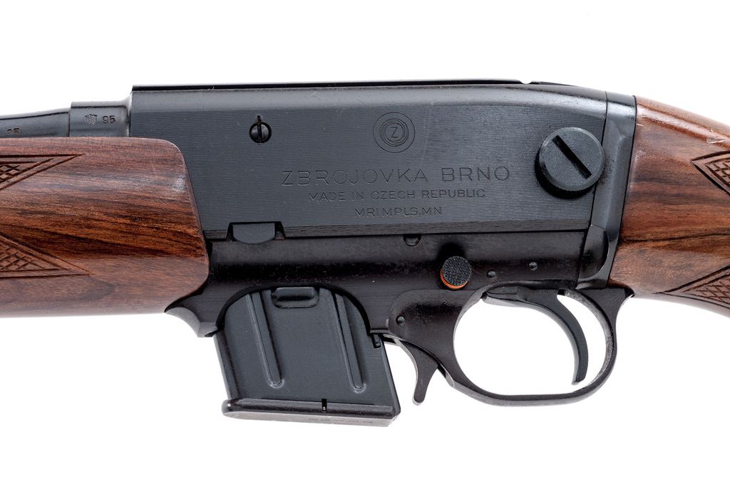 BRNO Model ZKM-611 Semi-Automatic Rifle, #551507240, .22 WMR cal., 20.5'' barrel, blue finish; checkered pistol-grip walnut stock and forend, factory black plastic CZ buttplate, sling swivels. Blade front sight on ramped base and ''U''-notched open rear sight, and includes one magazine. Top of receiver is grooved for scope mount. Left side of barrel and receiver are both proofmarked and stamped ''95''. Made in the Czech Republic. Condition overall is very good retaining approx. 97% original blue finish. Receiver with moderate scuffs and light scratches; front sight with some spots of light surface rust that should clean. Factory lettering is clear. Wood is nicely figured with mostly shallow impressions and scratches from storage; checkering with a couple of moderate flat spots, mainly on left side of forend. Smooth action, bright bore with excellent rifling; internally a clean rifle that does not appear to have been fired very often. Est.: $400-$600. (Modern)