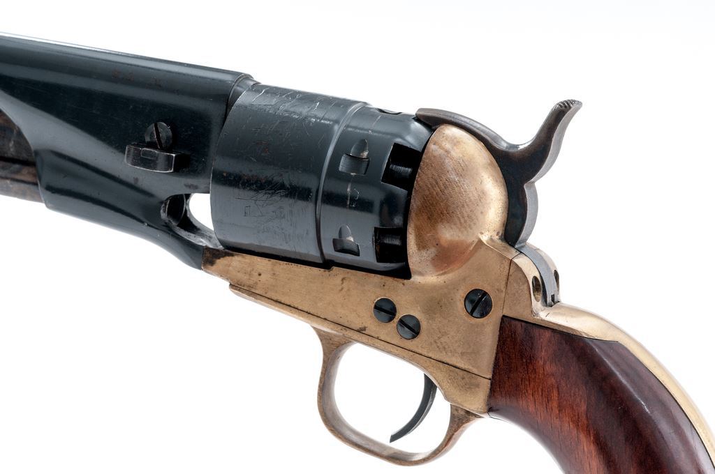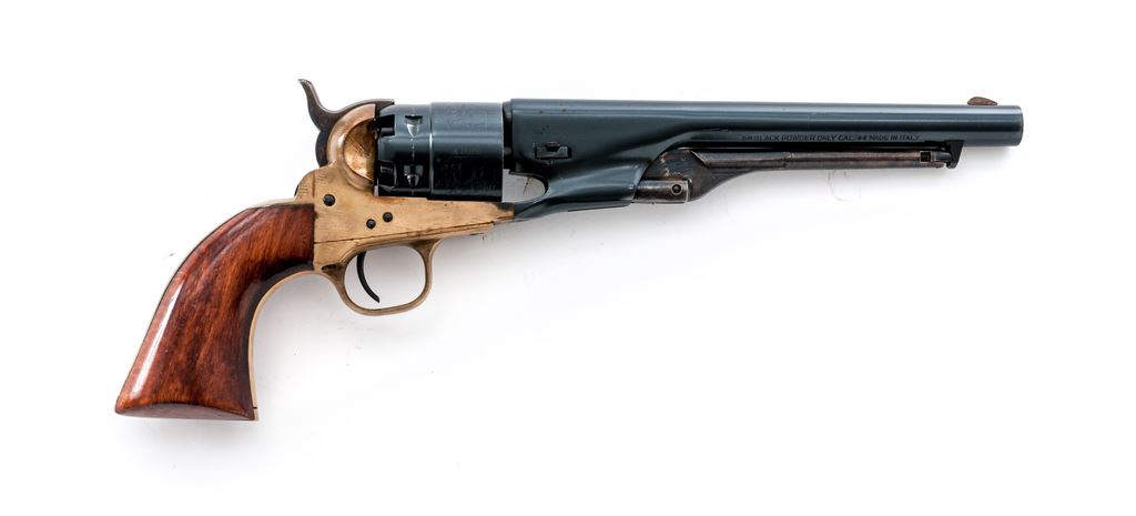 Italian Reproduction Colt Model 1860 Army Percussion Revolver, #25229, .44 cal., blued 8'' barrel is marked with black powder only warning, caliber, and ''Made In Italy'' on right side; blued round and rebated 6-shot cylinder is roll-engraved with sailing ships scene and ''Patent No.'' within two lines on circumference; case hardened hammer and ''creeping'' loading lever; brass frame and gripstraps; one-piece varnished hardwood grips. Condition is fine, the barrel and cylinder retaining most original blue with occasional handling marks and light wear at muzzle, the brass with light age patina. Grips retain most of their varnish finish. Action is tight and crisp; bore is shiny with deep rifling. Est.: $200-$300. (No FFL Required)