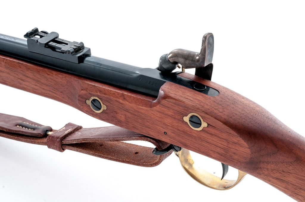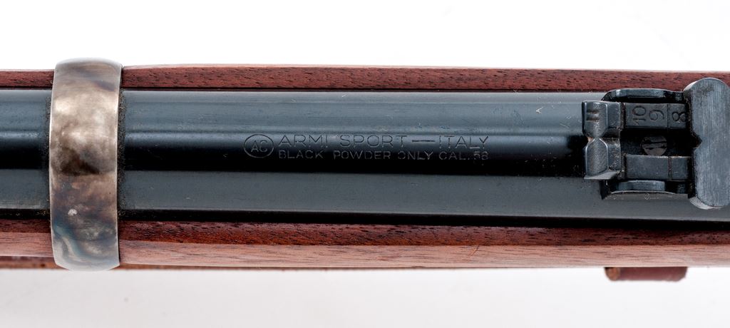Reproduction British Enfield Pattern 1853 3-Band Percussion Musket, with leather sling, tompion and nipple protector, #E12925, .58 cal., blued 39'' barrel, with block-blade front and adjustable sliding-leaf rear sights, marked ''AC'' within an oval, and ''Armi Sport - Italy/Black Powder Only Cal. 58'' in two lines behind lower band; case hardened lockplate with line border is marked ''1853 Enfield'' ahead of matching hammer, with a large crown behind; brass mountings include triggerguard (with iron sling swivel at front), buttplate, two ''winged'' sideplate escutcheons, and nosecap; oil-stained European walnut fullstock with three case hardened screw-held barrel bands (top band with sling swivel) retaining the slotted steel tulip-head ramrod. Condition is excellent and unfired, Barrel retains all of its deep blue; lockplate, hammer and barrel bands with fiery case colors, the brass with its original polish. Stock is smooth and sound showing only minor handling marks, pleasing grain and light color. Action is strong; mirror bore has sharp rifling. Russet sling is fine, as are the chain-retained lead nipple protector and brass-tipped tompion. Est.: $200-$400. (No FFL Required)