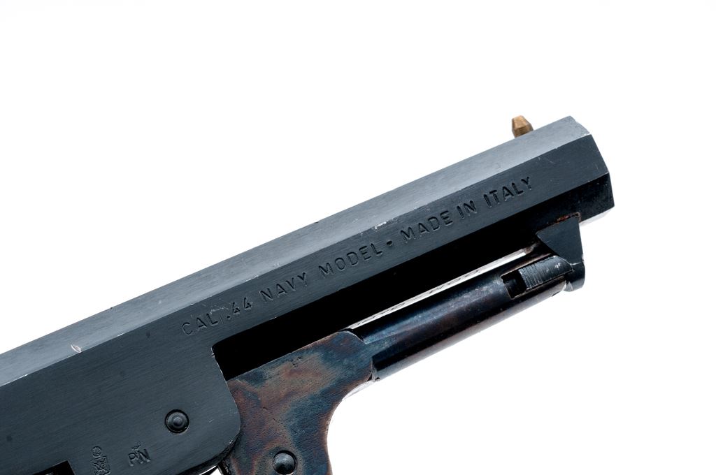 Replica Model 1851 Navy Style Percussion Revolver, #24545, .44 cal., blued 5'' octagonal barrel marked ''Cal .44 - Made in Italy'' with proofmarks on right side, and ''Black Powder Only'' on left; case hardened lever, plunger and hammer; blued 6-shot rebated round cylinder carries the rolled naval battle scene, ''Patent N.'' and various proofmarks; brass frame with right-side proofmarks and brass gripstraps; varnished one-piece hardwood grips. Condition is very good. Barrel and cylinder retain approx. 90% deep blue with occasional light roughness; lever, plunger and hammer show nice case colors, brass with a smooth age patina. Grips with approx. 90% varnish and scattered marks/dings. Action is crisp; bore is bright with interior blue and sharp rifling. Est.: $150-$250. (No FFL Required)