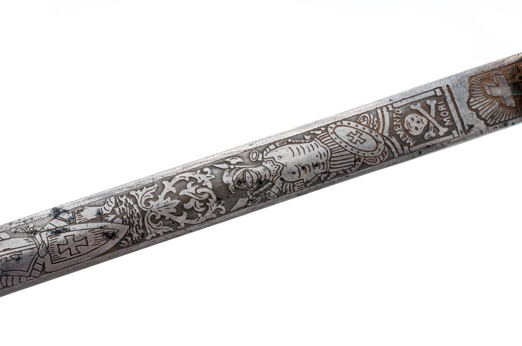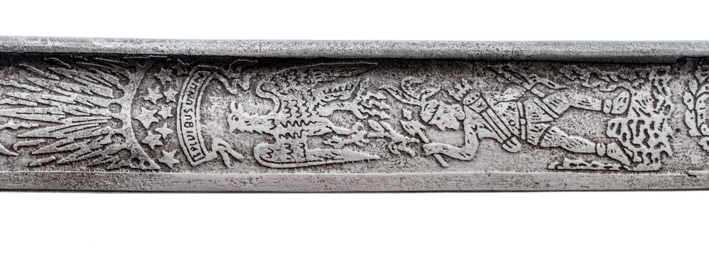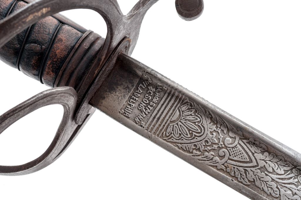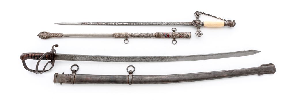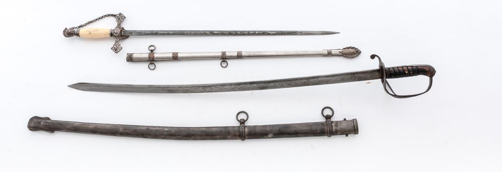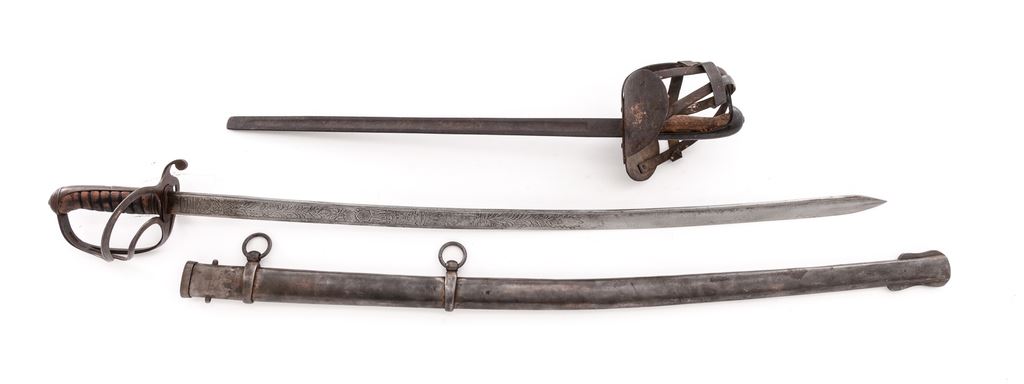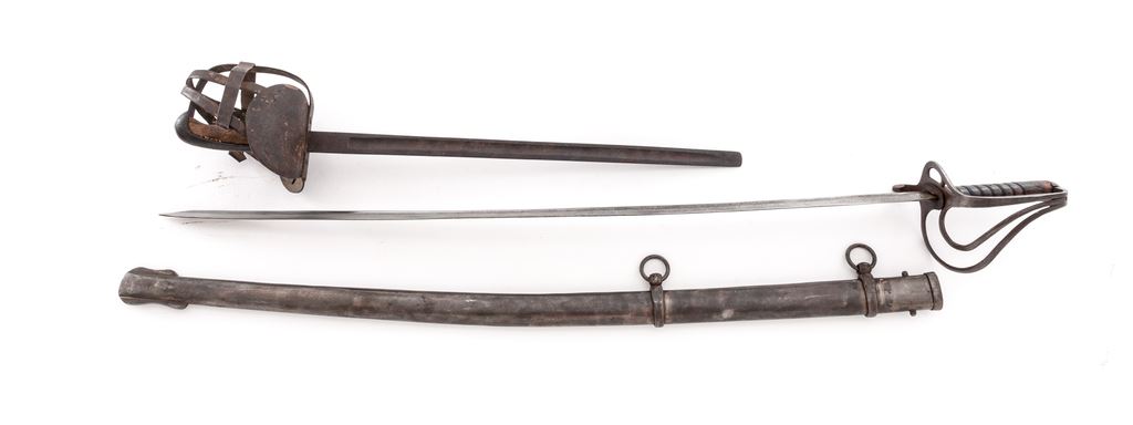 Lot of Two (2) Swords: (1) Reproduction M1833 U.S. Dragoon sword, with 35-1/2'' etched decorated blade and spurious Horstmann maker's mark. Grip is covered in brown leather and has a single untwisted strand of wire wrapping. The three-branch guard and backstrap are steel. Scabbard appears to be a real Austrian heavy Cavalry type without any markings. OAL is 42-1/2''. Condition is good with the blade having been artificially aged. Grip leather is scuffed and darkened. Scabbard has been wire brushed and has some light pitting. (2) Old German fencing sword with riveted basket guard and wood grip. The shortened blade measures 20'' with a single wide fuller in the middle, marked ''Made in Germany'' in an oval. Backstrap of the handle is steel. Grip is smooth wood, with remnants of a leather covering. Condition is fair with the basket guard bands bent and one broken. There is a dark rust patina on all the metal parts and blade. OAL is 26''. Est.: $100-$200/lot.