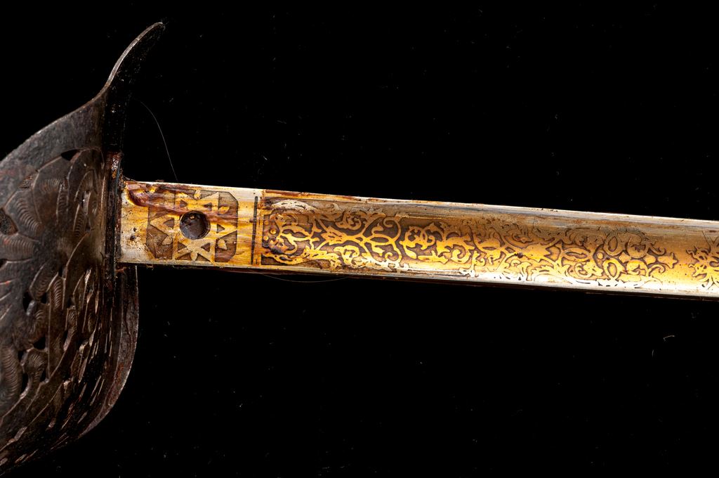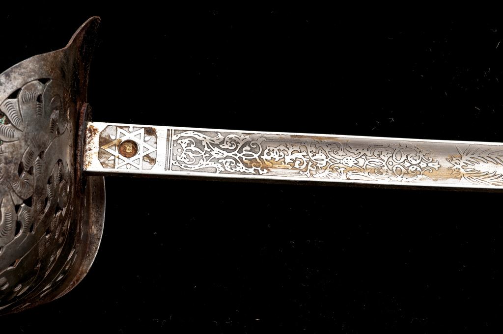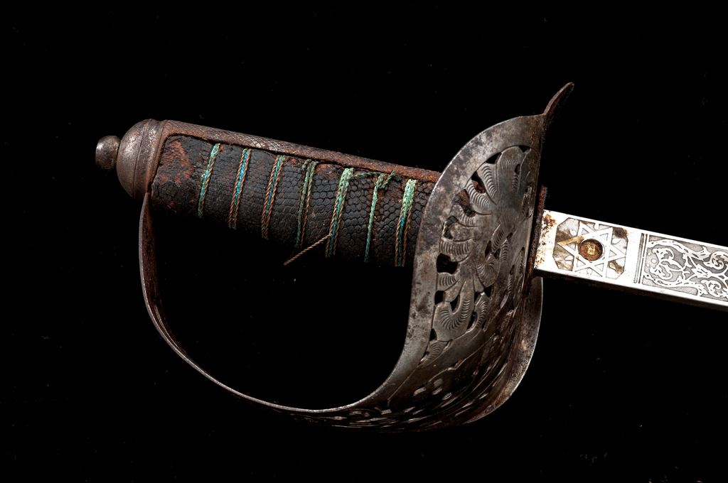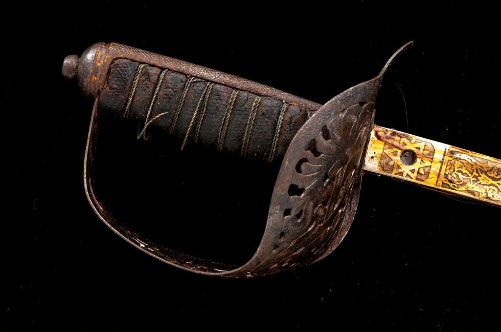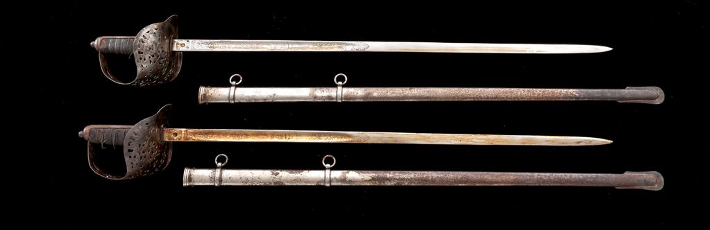 Lot of Two (2) Indian Made Copies of Model 1897 British Officers Swords, both copies made in India, of British Model 1897 Infantry officer's swords. Bright nickel-plated blades with etched floral decorations, crown, and royal cipher. Leather-covered grips with twisted wire wrapping. Pierced steel metal basket guards with Edward VII cipher and crown. Steel scabbards with two hanging rings. Blades are approx. 32'' long, OAL is 40.5''. Condition is fair with rust on the scabbards, losses to the leather grip covering, broken wire grip wrapping, and rust on the basket guards. The blades are mostly bright with a heavy coating of cosmoline grease. Est.: $100-$200/lot.