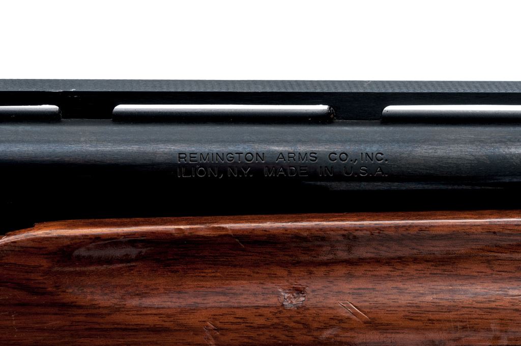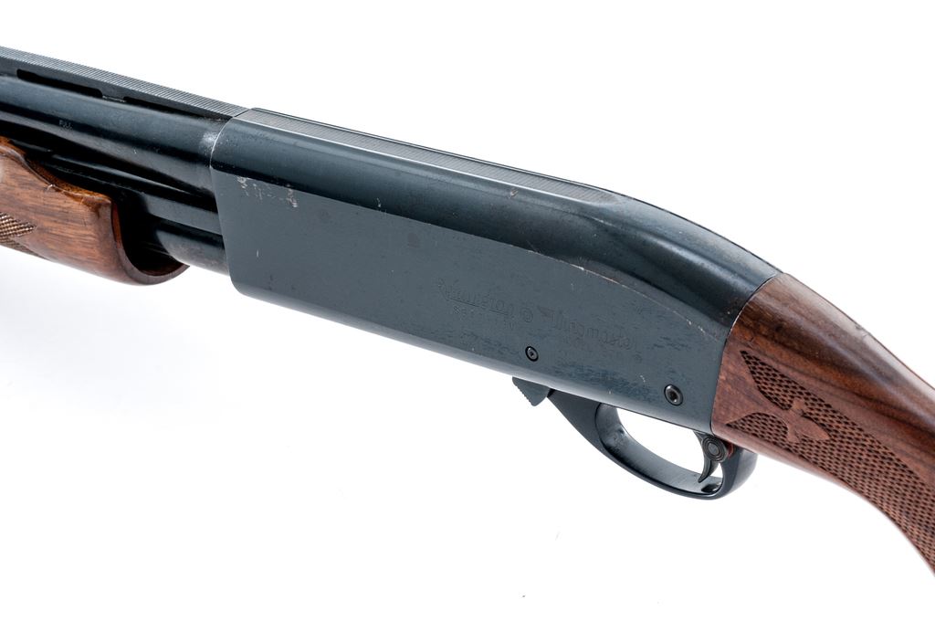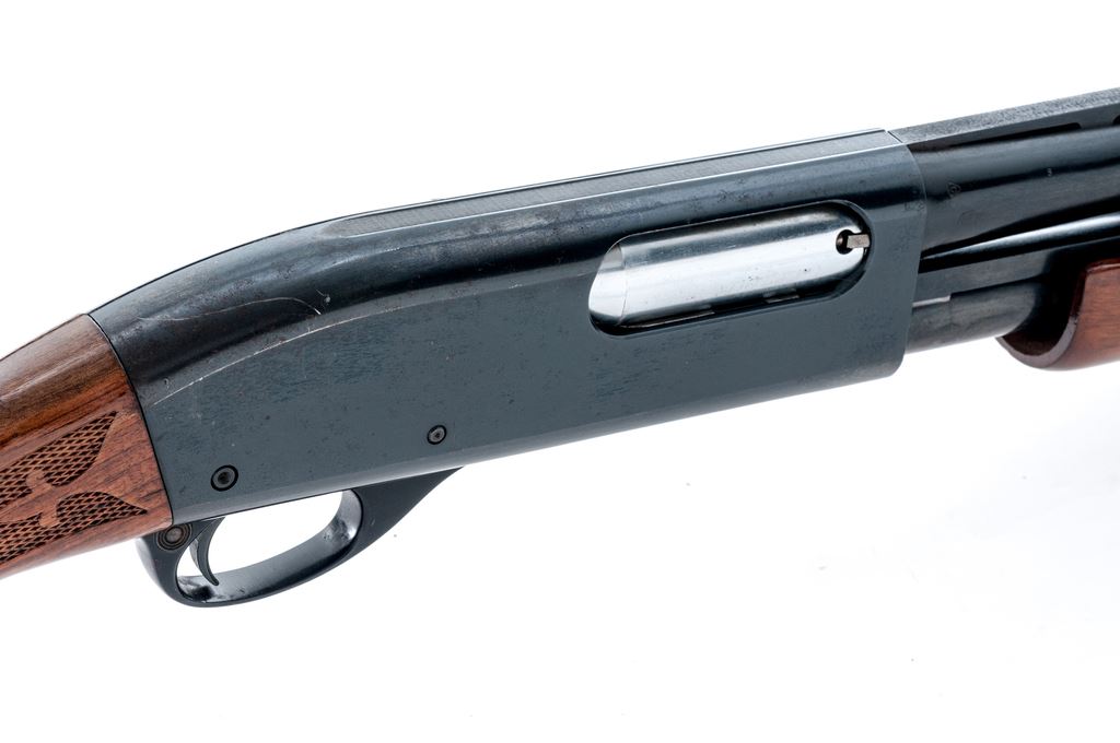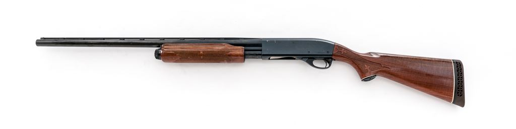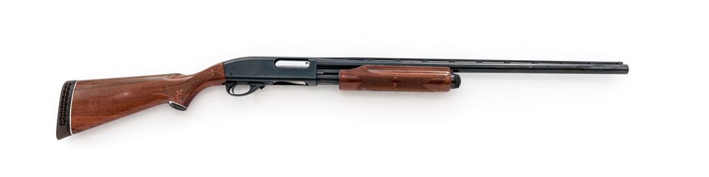 Remington Model 870 Wingmaster Pump Action Shotgun, #S940548V, 12 ga., 26'' vent rib barrel with silver bead front sight, 2-3/4'' chamber, Full choke, blue finish, fleur-de-lis pattern press checkered pistol-grip wood stock with gloss finish, vented brown rubber Remington recoil pad, and grip cap; LOP is 13.75''. Condition overall is good. Metal retains approx. 93%-95% original blue, receiver shows specks of light pitting and oxidation. Forend with general small dings and scratches; buttstock is relatively smooth with some thinning to the finish along the comb. Crisp action; bore with a little wear at the muzzle and is otherwise clean and bright. Est.: $125-$250. (Modern)
