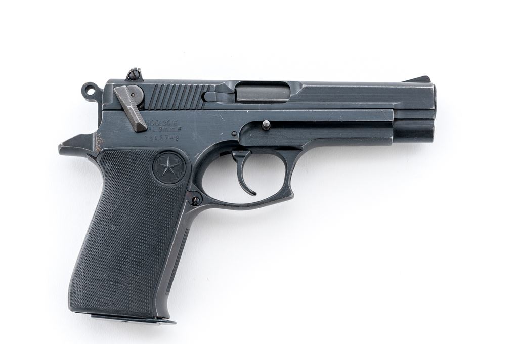 Star Model 30M Semi-Automatic Pistol, #1848749, 9mm cal., 4.25'' barrel, combination matte and satin blue finish, checkered black rubber Star grips, ambidextrous safety, ramped white line front sight and red two-dot square notched rear sight that is windage adjustable, with one 15-round magazine. Condition is good, majority of the original finish remains. Left side of slide with considerable pitting along the upper edge; left side of frame with specks of lighter pitting and surface rust. Factory lettering is clear. Grips are near excellent. Smooth action, bright bore with excellent rifling. Est.: $150-$250. (Modern/PPT)(High cap mags not available to Calif. residents.)