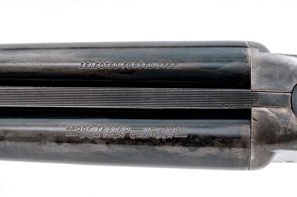Stevens Model 5100 Side-by-Side Shotgun, NVSN, 16 ga., 28'' blued steel barrels with 2-3/4'' chambers choked IM/IC, with silver bead front sight, missing the mid-sight, color case hardened receiver; pistol-grip hardwood stock, Bakelite forend, vented brown rubber Pachmayr recoil pad, with automatic safety and extractors. Barrel and frame with standard markings which includes and engraved pointer on the left side of the frame. Condition is very good overall. Barrel appears to have been cleaned and retains approx. 40% blue finish with some spots of very light pitting. Frame with approx. 75% case colors, lower right edges with a few tiny impressions; factory lettering on both the barrel and frame is clear. Buttstock is excellent with very minimal handling marks and an added coat of finish; forend shows moderate handling wear, no chips or cracks. Good action; bores are clean and bright. Est.: $125-$225. (C&R)