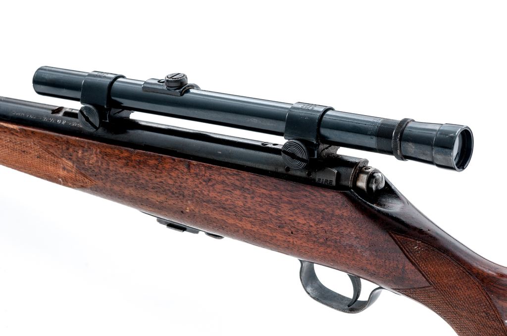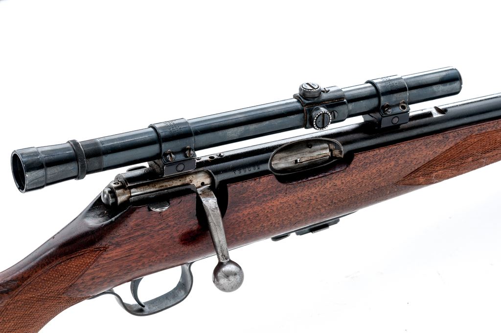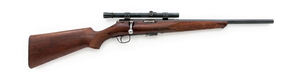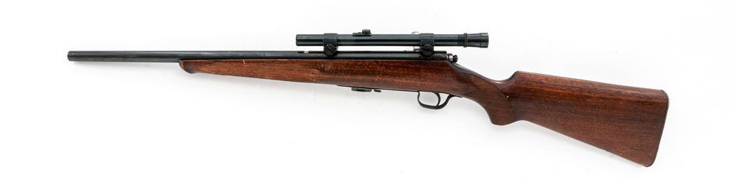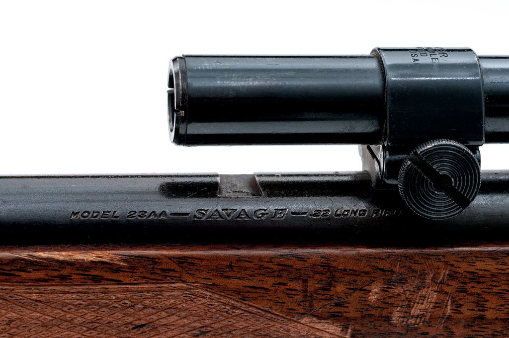 Savage Sporter Model 23AA Bolt Action Rifle, #139082, .22 LR cal., barrel has been shortened to 18.25'' as a result the rifle does not have a front sight, metal with a blue finish; one-piece walnut stock is checkered at both the pistol-grip and forend with a serrated steel ''SVG'' buttplate. Rear sight has been removed and rifle has been topped with a Weaver B4 scope on Weaver 3/4'' rings; scope with fine crosshair reticle and gloss dark blue/black finish. Condition is good retaining approx. 70% toning blue finish, balance a mild brown patina; factory lettering is clear. Stock is serviceable with general dings and scratches, heavier at the forend which includes the checkering; bottom edge of buttstock and tip of the Schnabel forend with a putty type repair. Speedlock bolt functions smoothly; bright erosion free bore with excellent rifling. Scope is very good, exterior shows normal light age and wear; optics are a little cloudy but free of any chips or other damage. Est.: $100-$200. (C&R)