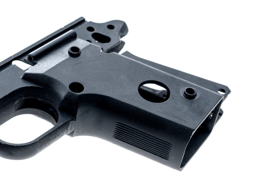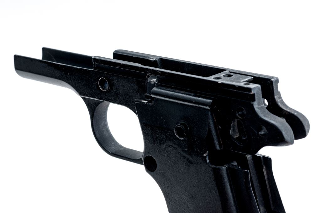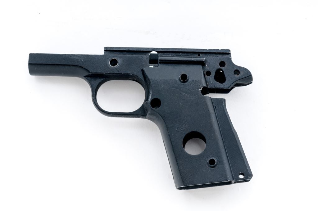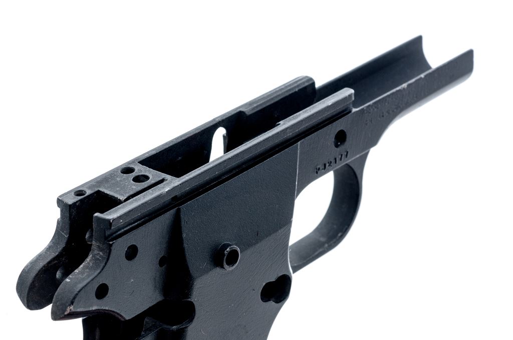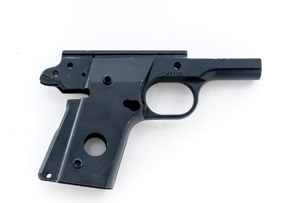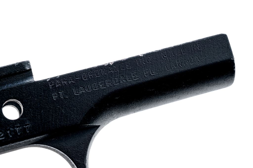 Para-Ordnance Semi-Automatic Pistol Aluminum Frame Only, #PJ2177, appears to be for a sub-compact .45 caliber pistol and measures 6.25'' long and 4'' tall, with a matte black finish. Made in Canada. Condition overall is very good. Edges where the frame would meet the slide with some finish wear and tiny surface nicks. Approx. 97% of the black finish remains with clear factory lettering. Est.: $100-$200. (Modern/PPT)