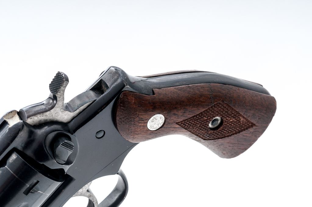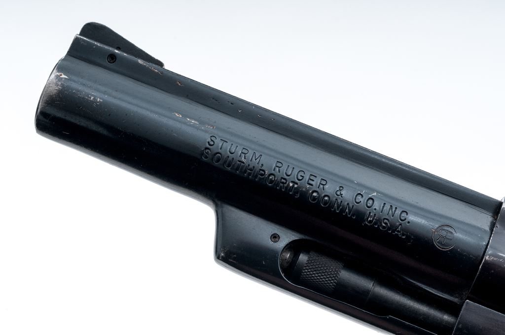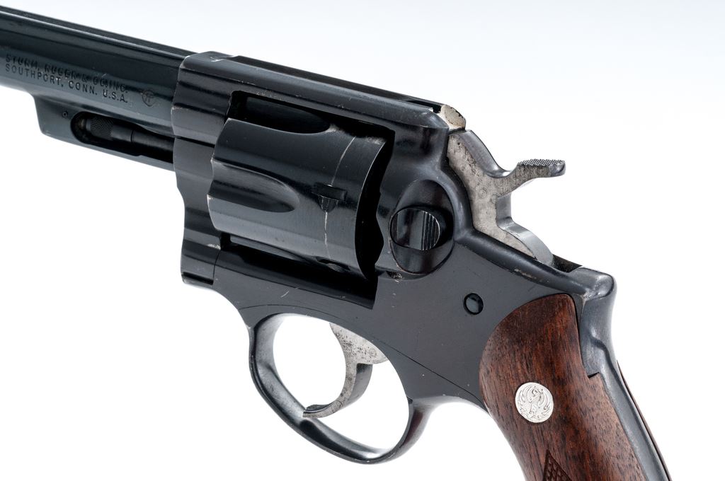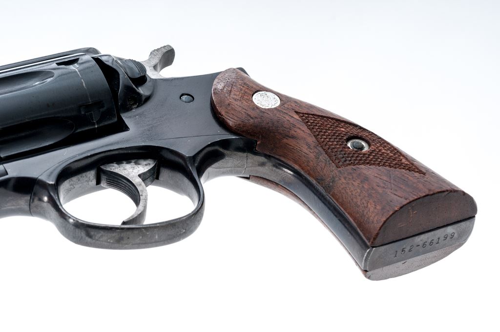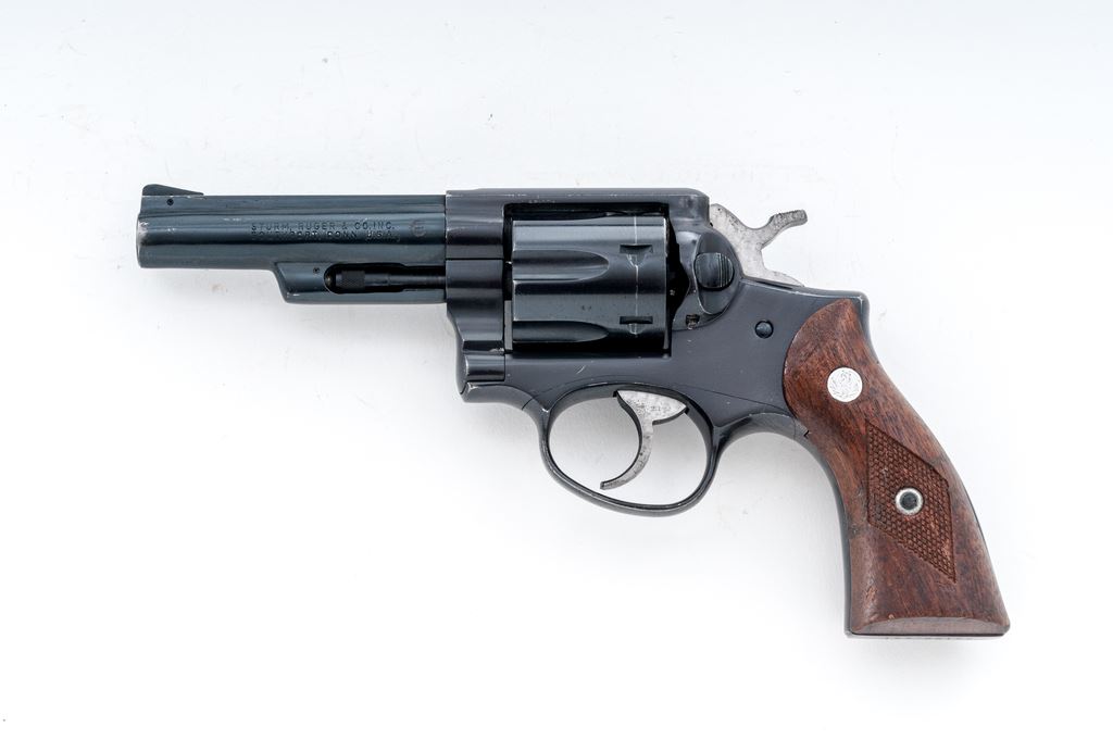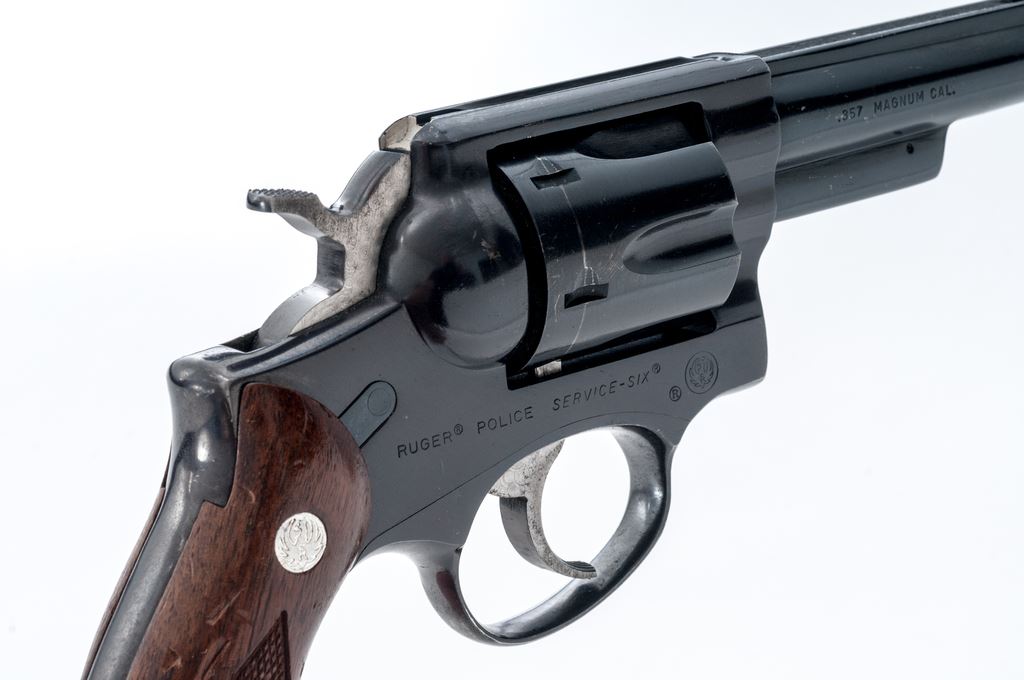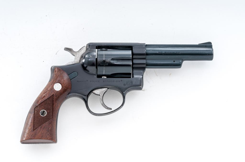 Ruger Police Service Six Model 107 Double Action Revolver, #152-66199, .357 mag cal., 4'' barrel, blue finish, standard fixed sights, checkered diamond center walnut grips with silver Ruger medallions, jeweled hammer and trigger. Condition is good retaining approx. 90% blue finish with plum-colored frame. Backstrap shows thinning and toning and the metal with light scuffs and scratches overall, factory lettering is clear. Grips show age and wear consistent with the rest of the revolver, including a few larger impressions on the right grip. Front sight is a little loose with added red paint to the ramped edge; rear sight has been highlighted with white paint. Cylinder with a little play, hammer and trigger operate smoothly; moderately frost bore with good rifling. Est.: $150-$250. (Modern/PPT)