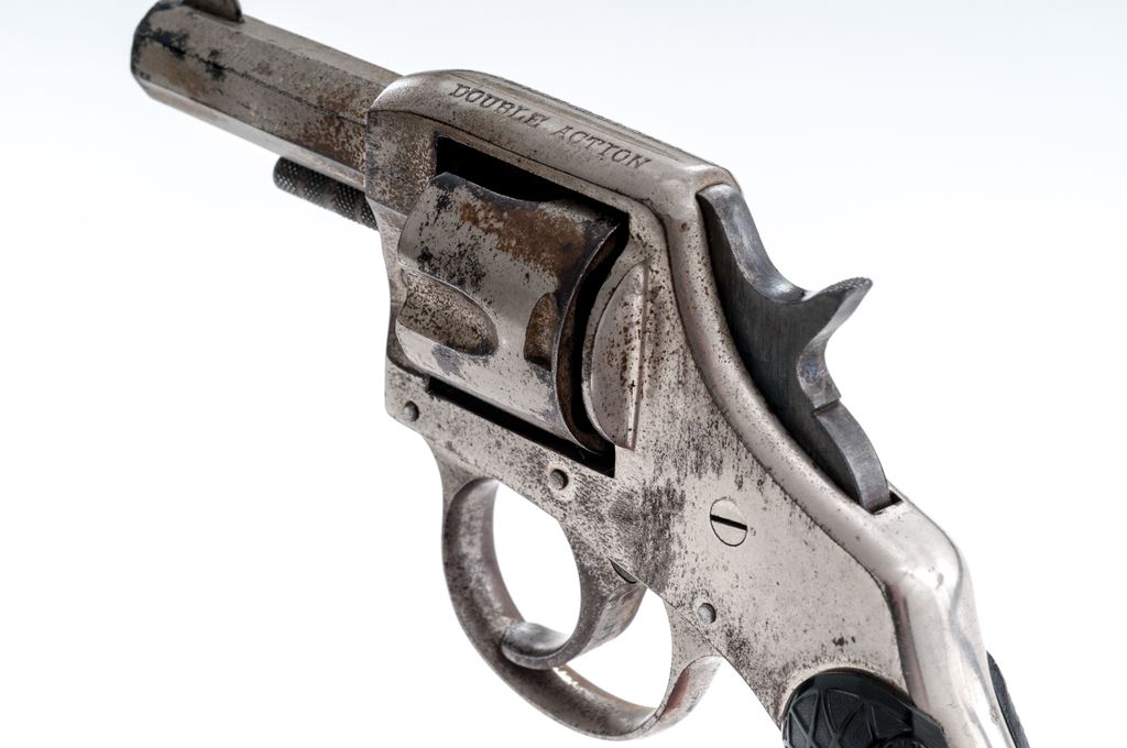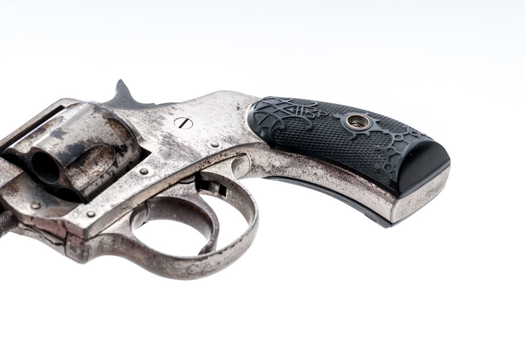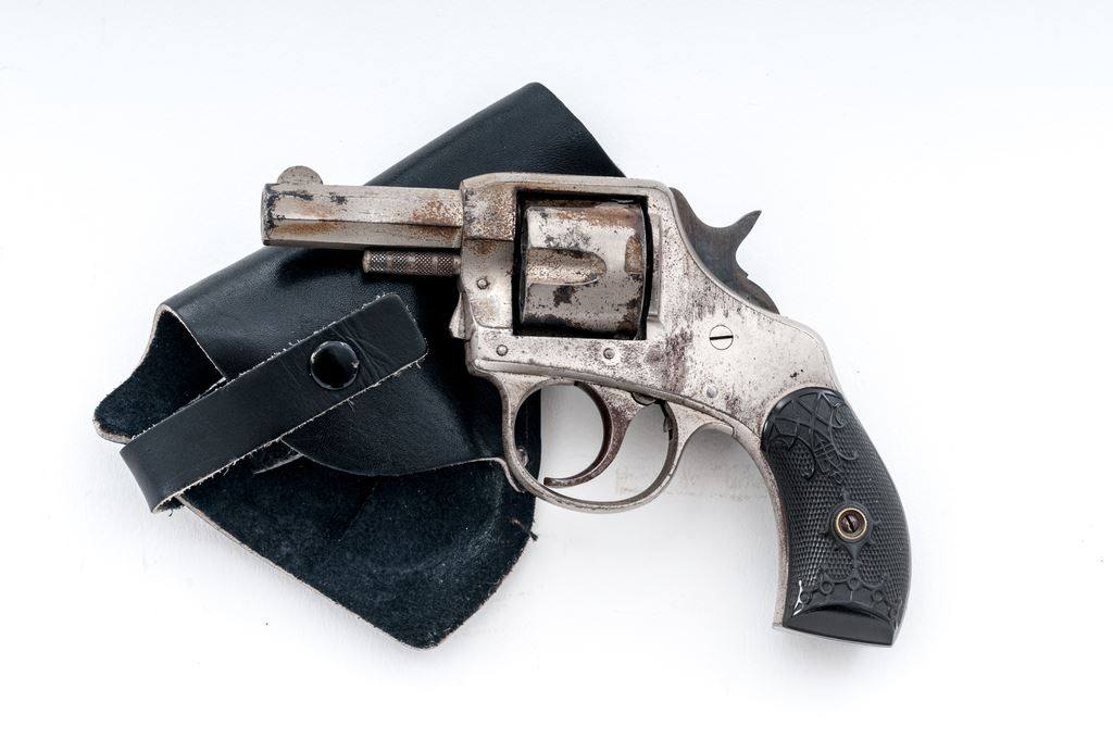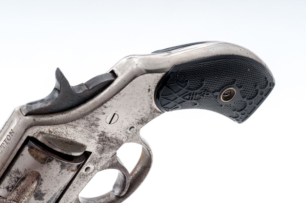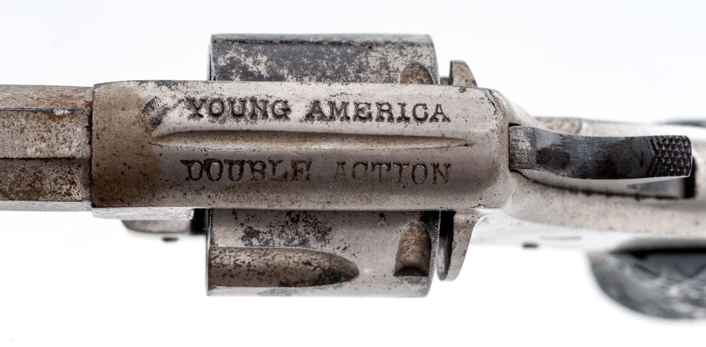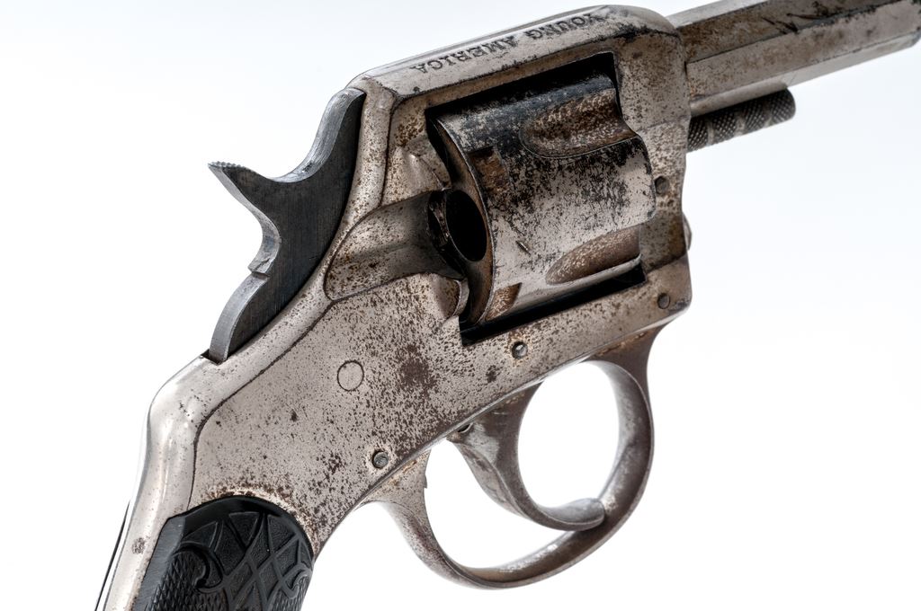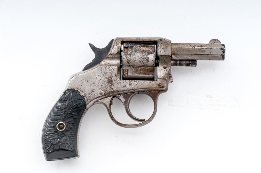 Antique Harrington & Richardson ''Young America'' Double Action Pocket Revolver, 2nd Variation, with holster, NVSN, .32 S&W CF cal., 2'' octagonal barrel with integral blade front sight; solid frame with integral gripstraps marked on top ''Young America Double Action''; fluted round 5-shot cylinder; finely checkered two-piece black hard rubber grips with fancy Art Nouveau-style interlocking designs in relief. Mfg'd ca. 1888-97, originally with full nickel-plated finish and case hardened hammer. Condition is very good retaining approx. 70% original nickel, dulling and with light roughness in places (50% nickel on cylinder, with scattered erosion); hammer with mottled case colors. Grips are very fine with sharp checkering and detail. Action is smooth in both single- and double-actions; bore shows scattered roughness and defined rifling. Modern black leather holster is fine. Est.: $50-$100. (Antique)