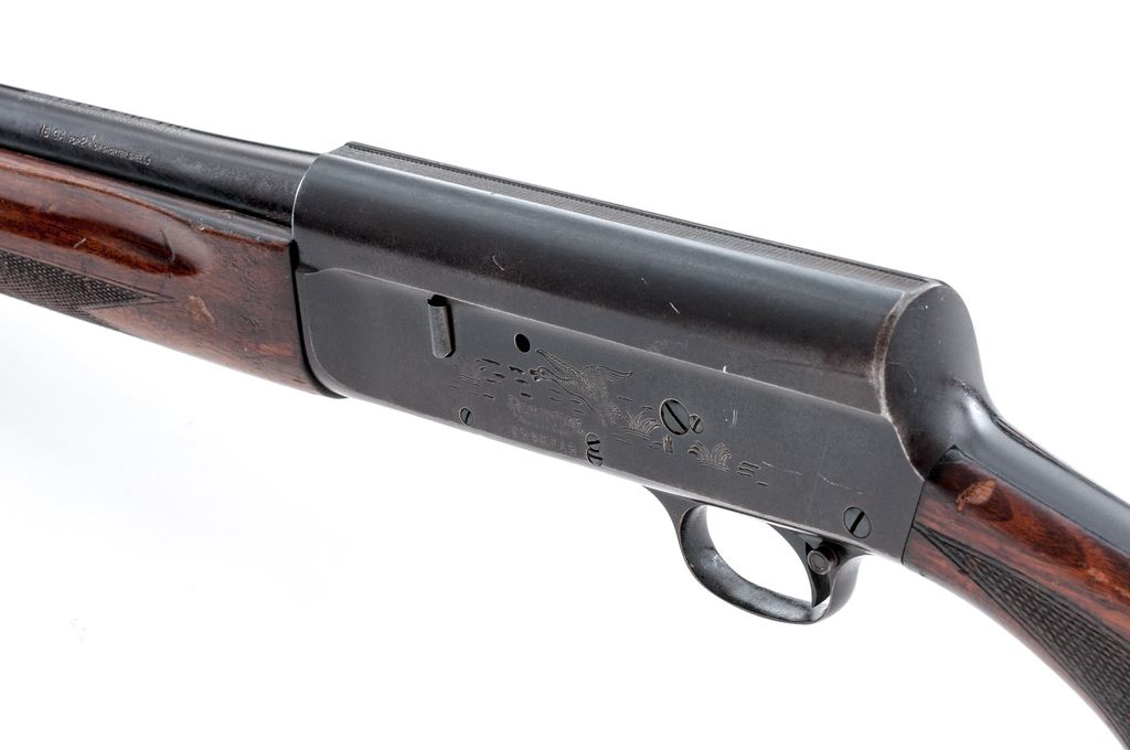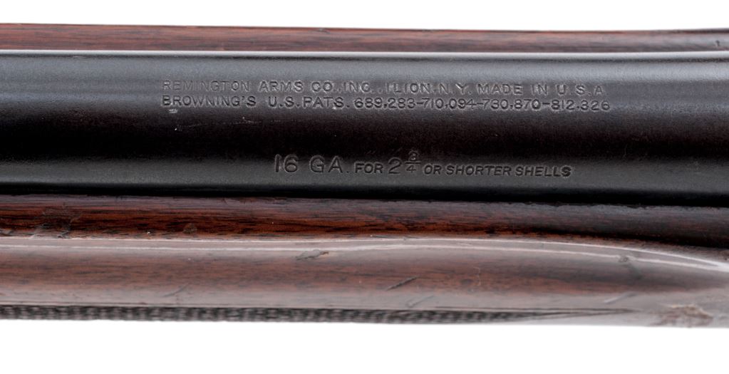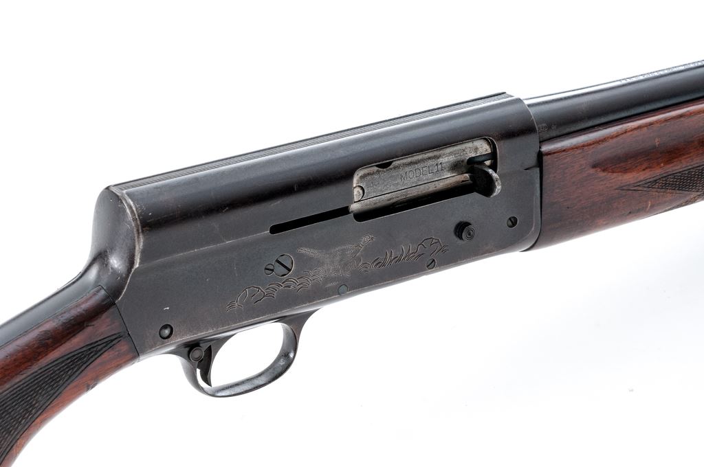 Remington Model 11 Semi-Automatic Shotgun, #1540715, 16 ga., 28'' plain barrel which includes the external adjustable Poly Choke, 2-3/4'' chamber, blue finish; receiver with pheasant and duck roll engraving. Bolt is marked ''Model 11''. Checkered pistol-grip walnut stock and forend, with brown composition Remington buttplate. Barrel date code is ''EJ'', mfg'd 1940. Condition is good. Metal is a combination toning blue finish and mottled brown patina; factory lettering and roll engraving is clear. Wood with numerous gouges and scratches, but remains solid; no cracks. Action is smooth and tight; excellent bright bore. Est.: $125-$225. (C&R)