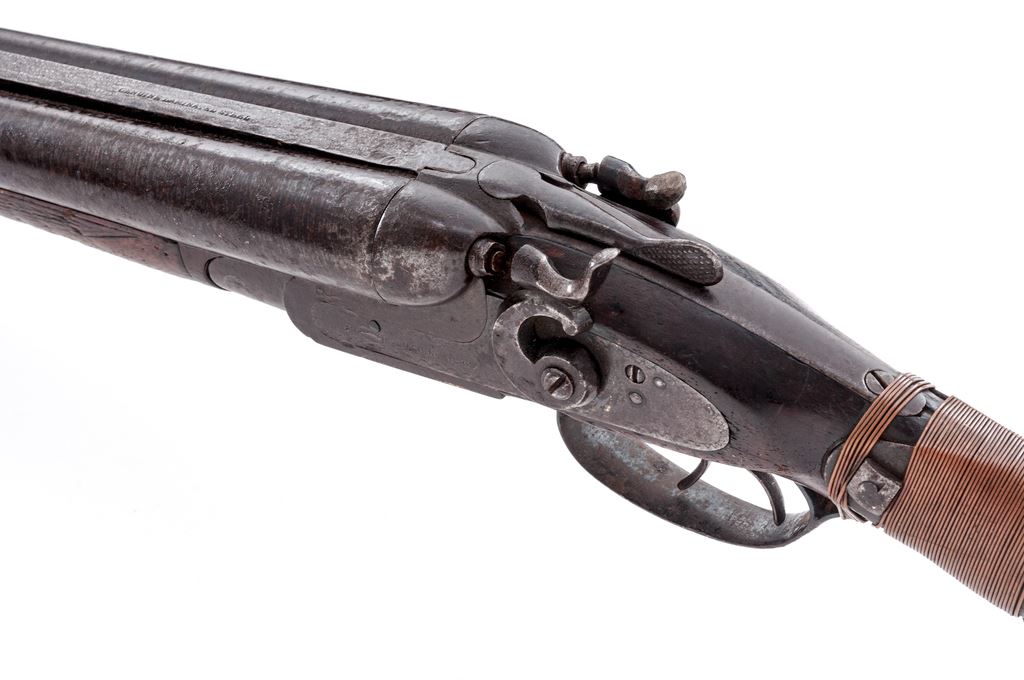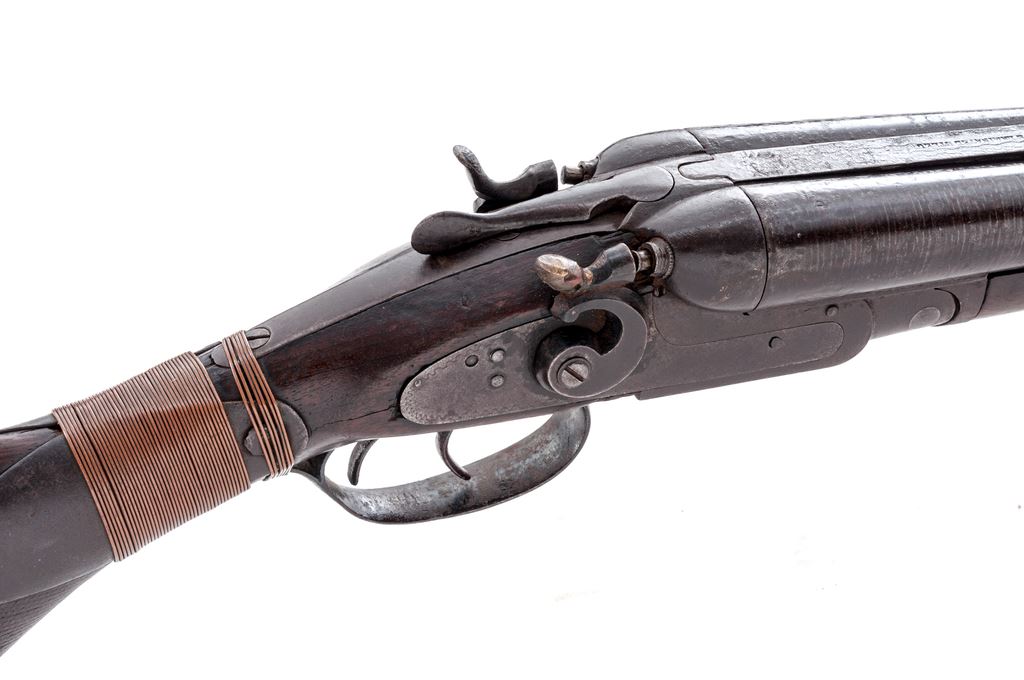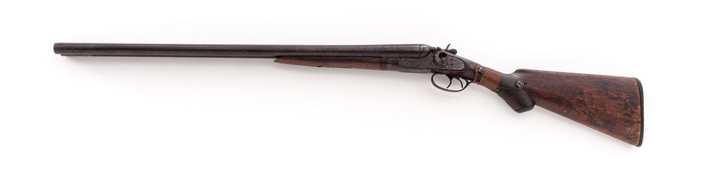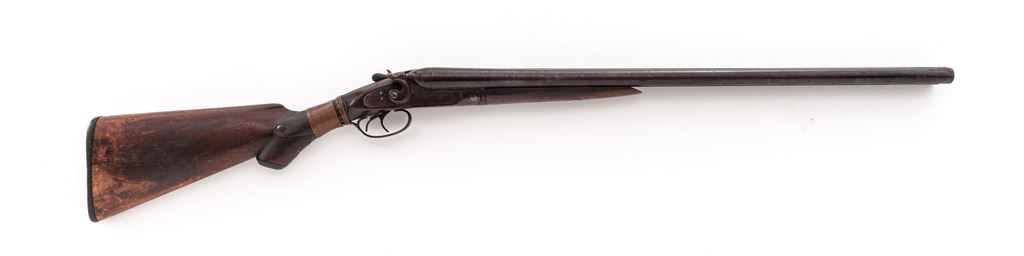 American Gun Co. Side-by-Side Double Barrel Shotgun, #57153, 12/12 ga., 26.5'' twist barrels with full-length matted rib marked ''Genuine Laminated Steel'' near breech; steel receiver is marked ''American Gun Co. New York'' on left side, has matching curved hammers, floating firing pins, a top break-open lever, two triggers, and loop triggerguard; oil-finished and checkered splinter forend, matching pistol-grip buttstock checkered at wrist, with an oval hard rubber pistol-grip cap and checkered hard rubber buttplate having a dog's head with game bird in its mouth in a circular relief panel. Condition is fair to good. Metal parts show an overall dark age-brown with scattered pitting; barrels have traces of twist pattern and poor solder repairs at top and bottom of muzzles; one trigger spur is broken off. Stocks show wear, with metal plates bolted to each side at wrist and wrapped with copper wire over an old break, age and use marks, wear to checkering and buttplate decoration. Actions seem to function; smoothbores are dirty. Est.: $100-$200. (C&R)