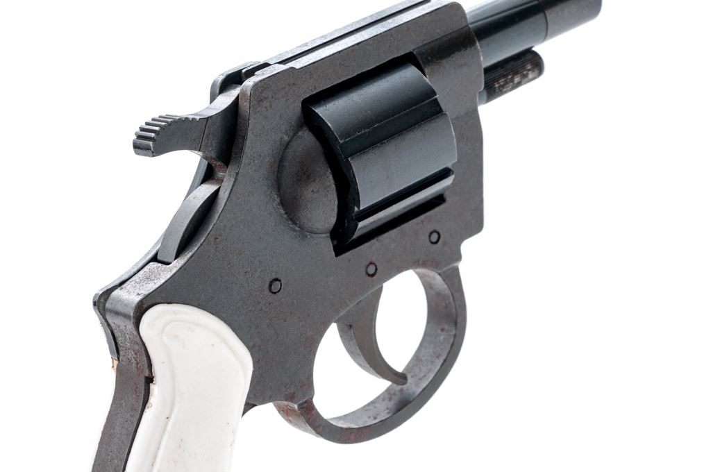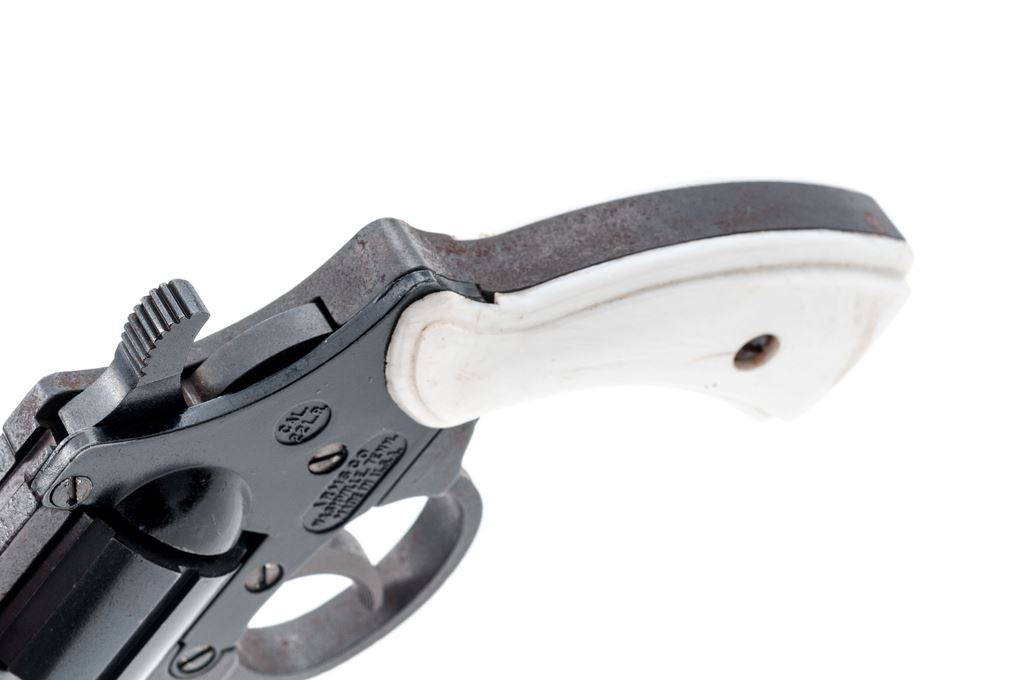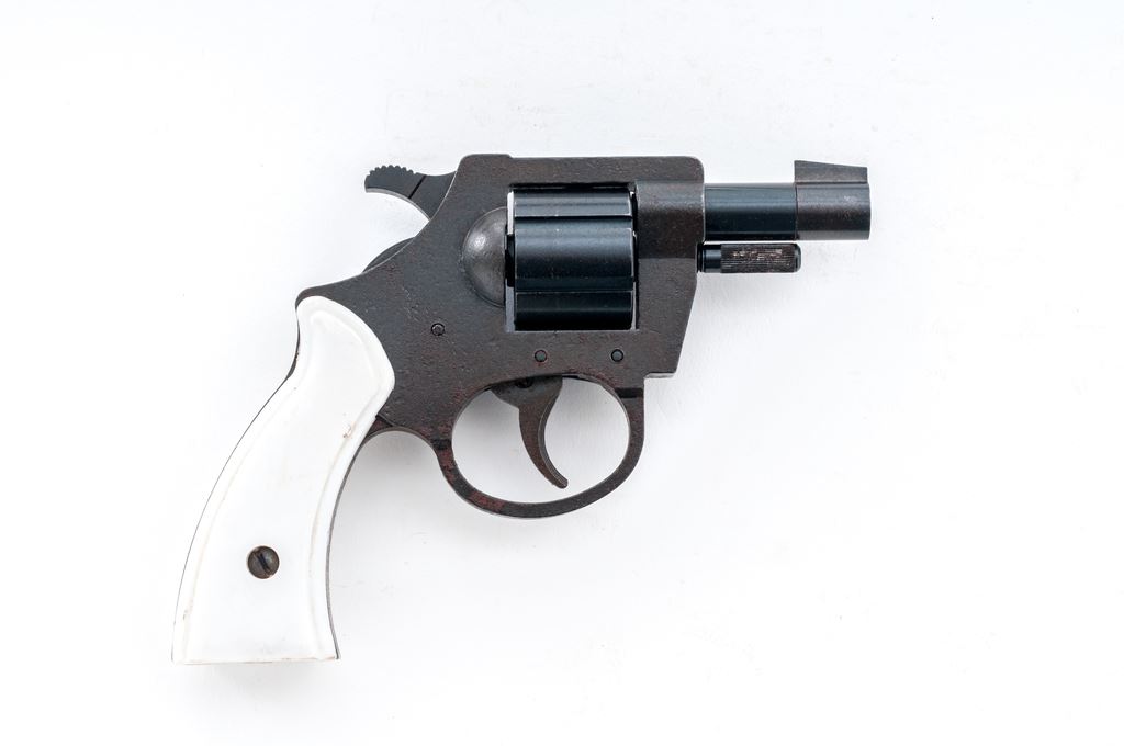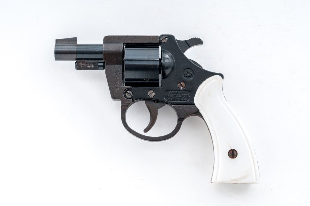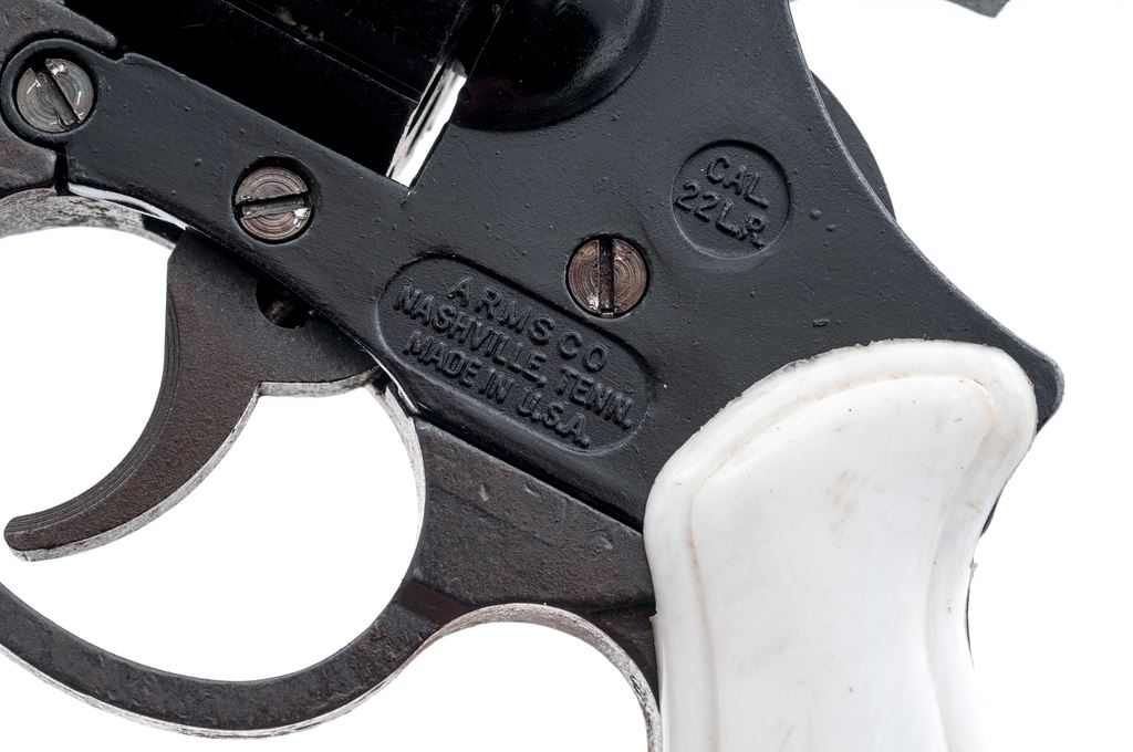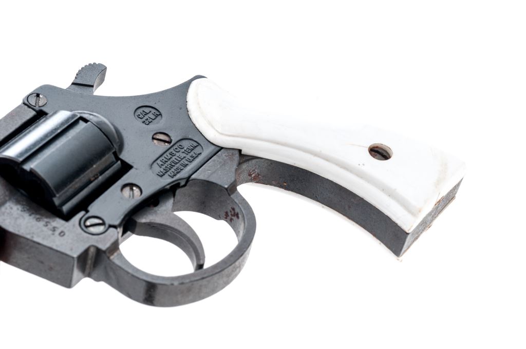 Arms Co. Model 059 Double Action Revolver, #055915, .22 LR cal., 7-shot, 2'' barrel, combination blue and black finish, white plastic grips, with standard fixed sights. Condition is fair. Parts of the frame are lightly pitted with mild surface rust. Left grip with a hairline crack near the retaining screw and both with general light handling marks. Bore is very good. This revolver currently only functions as a double action. Est.: $40-$80. (C&R)