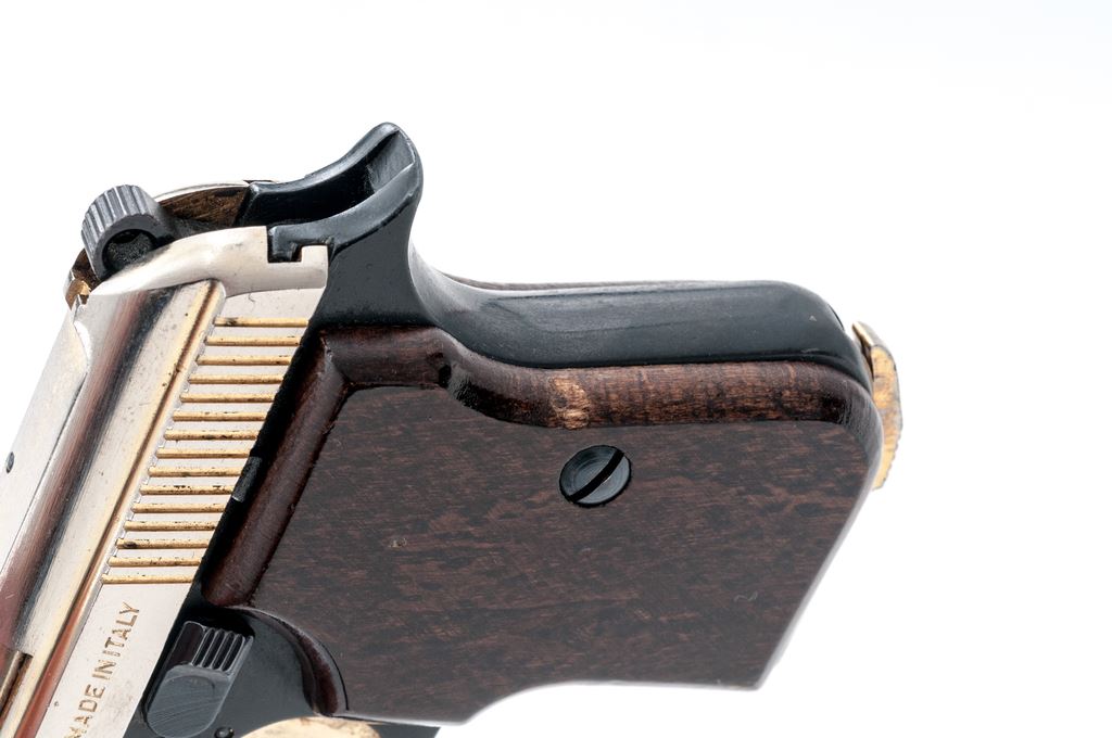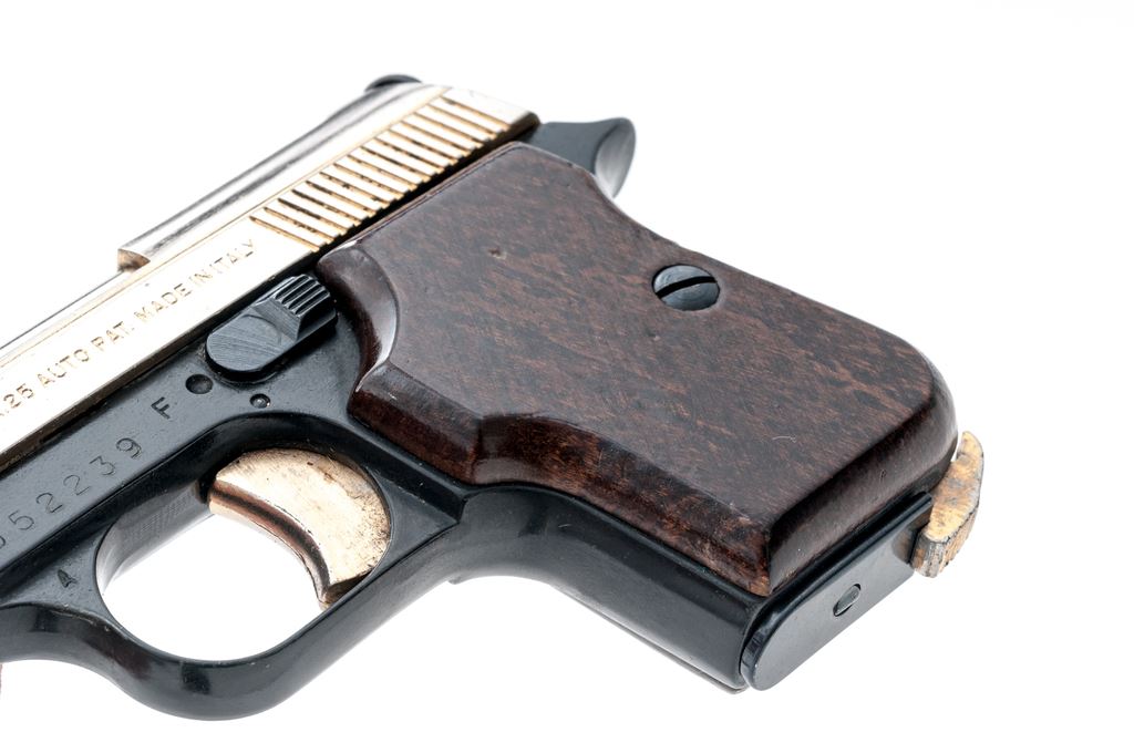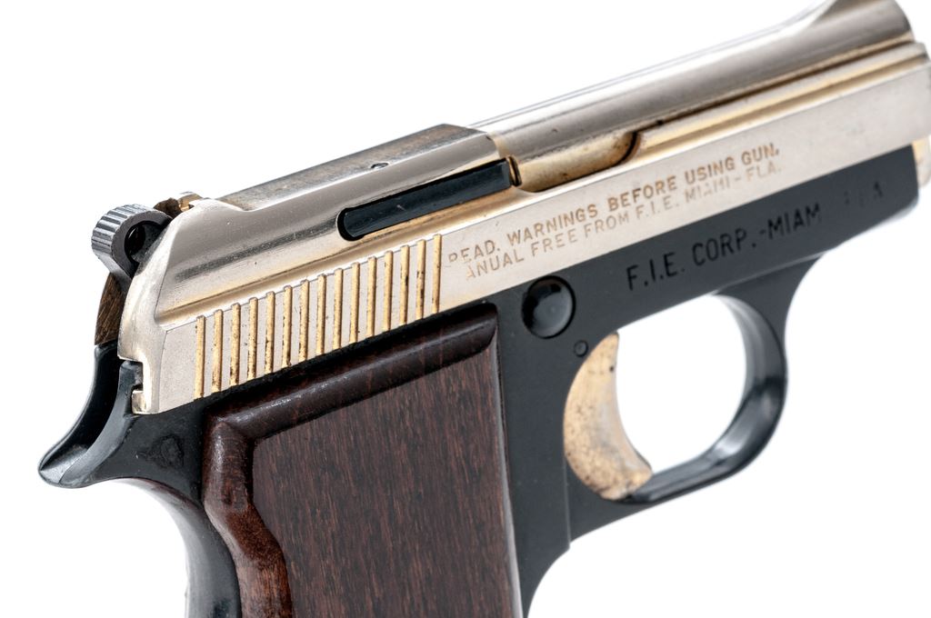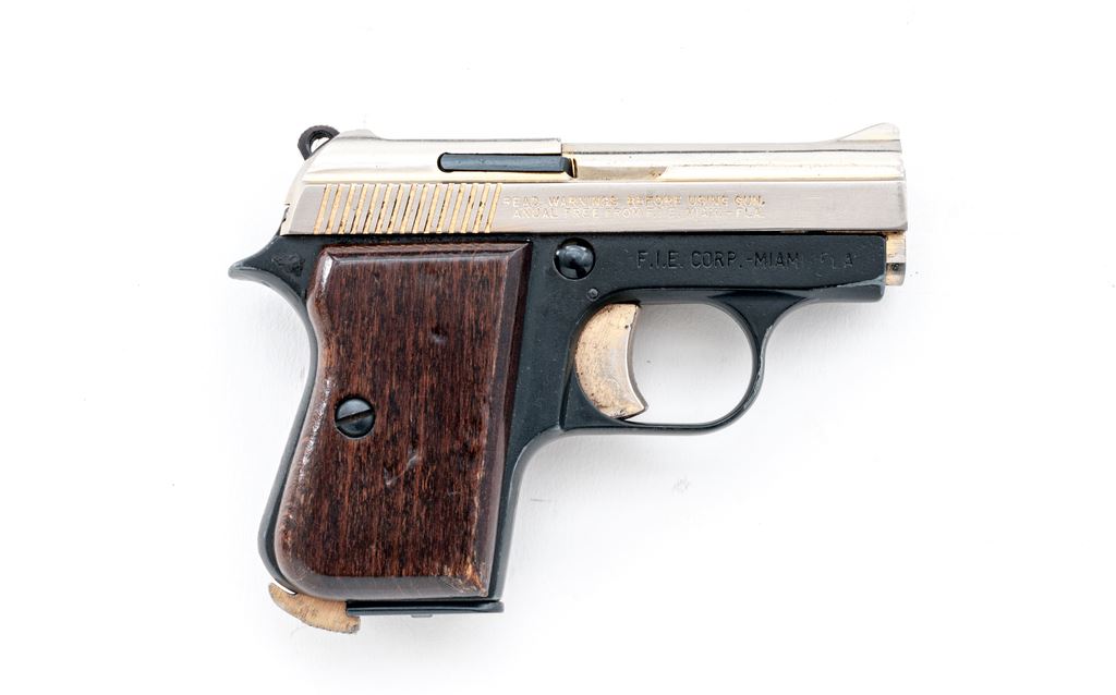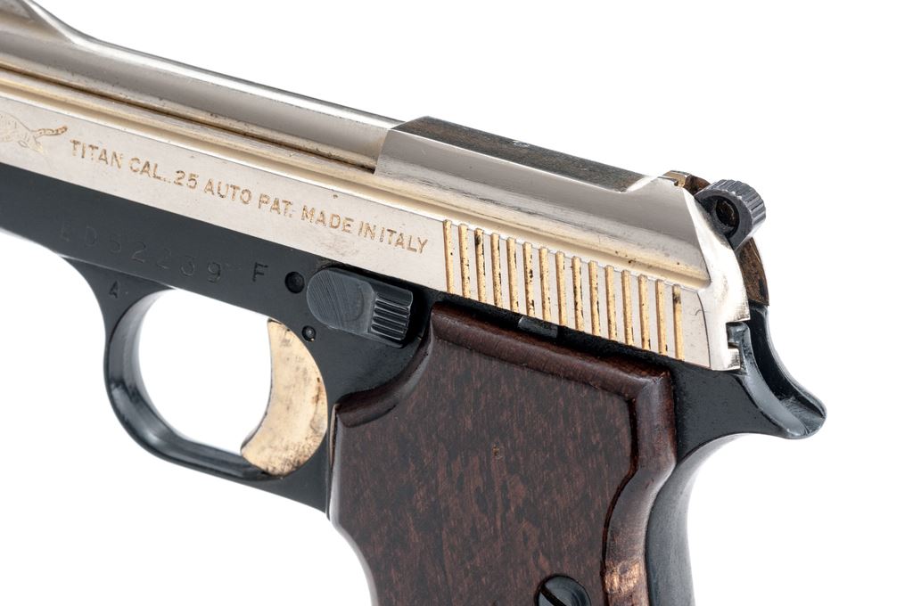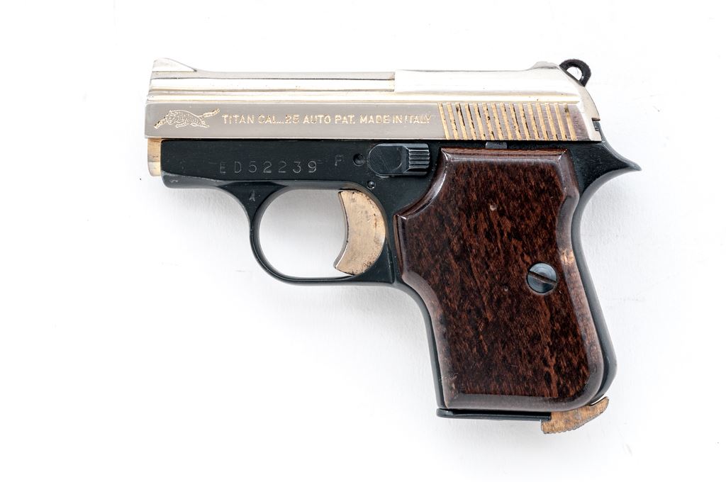 FIE Titan Semi-Automatic Pistol, #ED52239, .25 ACP cal., 2.25'' barrel, black frame, straw colored slide and other small parts, smooth wood grips, with one magazine. Condition is good showing a majority black finish. Straw colors have thinned and toned. Grips with a few dents and scratches. Good action and bore. Est.: $60-$120. (Modern) (Not available to Calif. residents.)