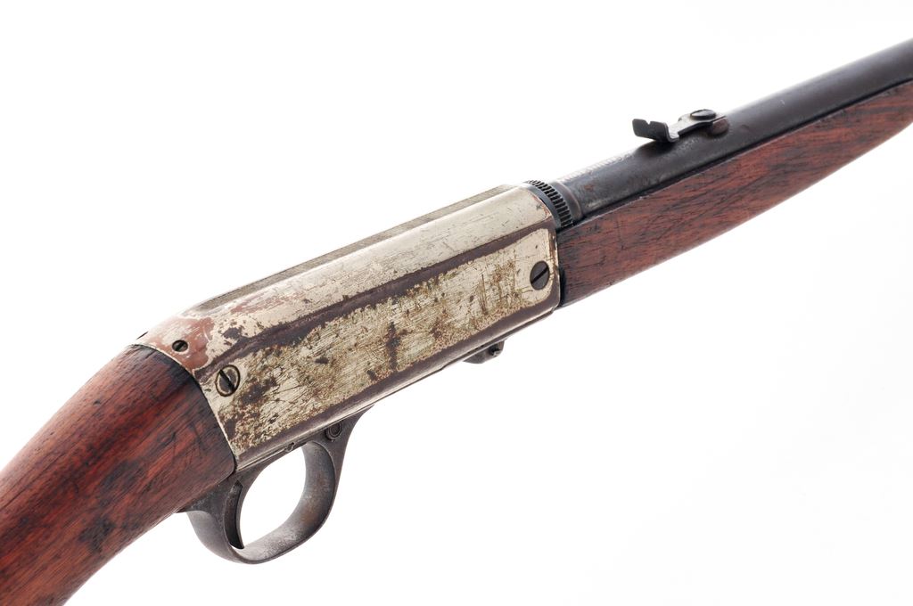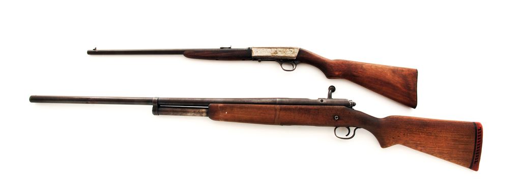 Lot of Two (2) Project Long Guns, by Remington & J.C. Higgins: 1.) Remington Model 24 Semi-Auto Rifle, #67694, .22 Short cal., 19'' barrel, smooth walnut stock, smooth steel ''Remington UMC'' buttplate, dovetailed front sight, notched rear sight with adjustment screw. Condition is fair. Receiver with a worn silver-colored finish; other metal surfaces have toned brown; barrel address is visible. Wood shows age and wear consistent with the rest of the rifle and retains little finish; stock shows some scratching that appears to be from a course sand paper. Good action and bore. 2.) J.C. Higgins Model 583.20 Bolt Action Shotgun, #MX7928, 12 ga., 2-3/4'' chamber, 28'' barrel choked Full, one-piece pistol grip wood stock, with red rubber J.C. Higgins pad. Shotgun is in fair condition with little finish on the stock or metal. Factory lettering is clear. Bolt retaining screw is a replacement; also the screw that attaches the frame to the wood is broken and needs replacement. Good action, nice bore. Est.: $100-$200/lot. (Both/C&R)