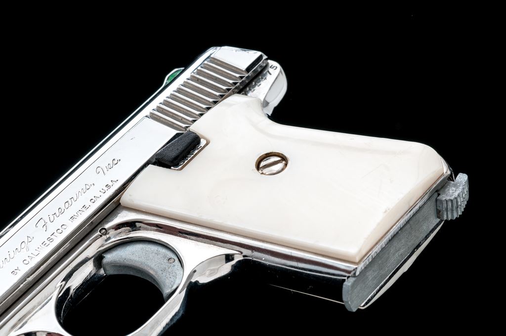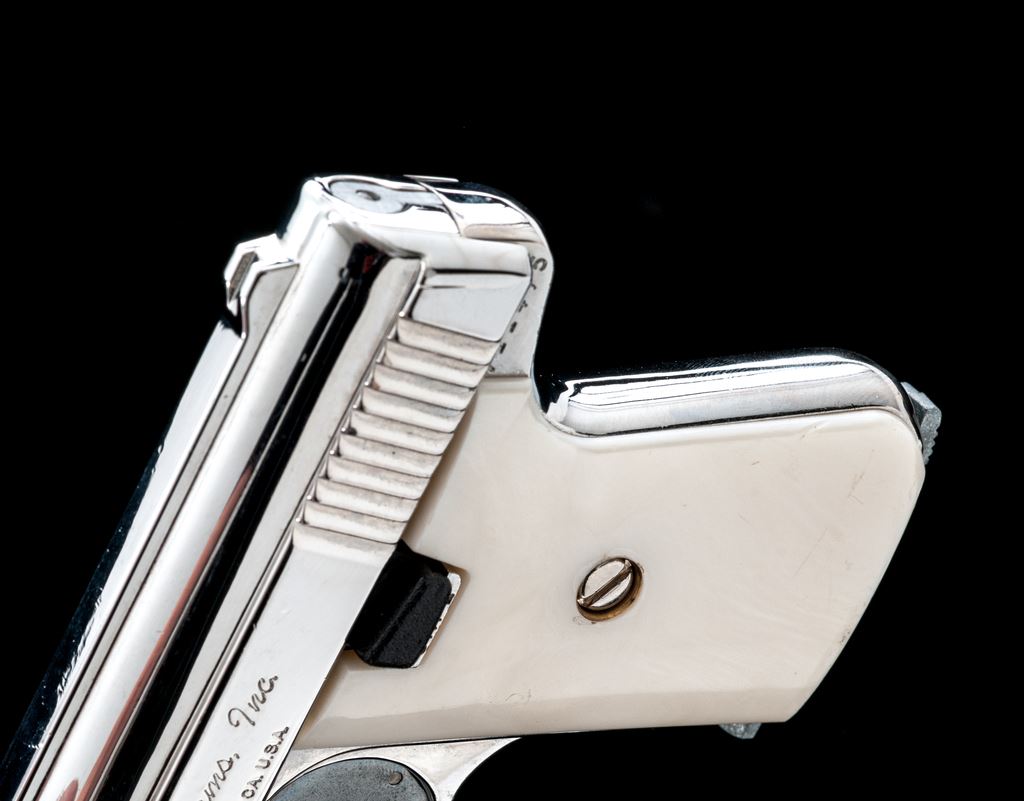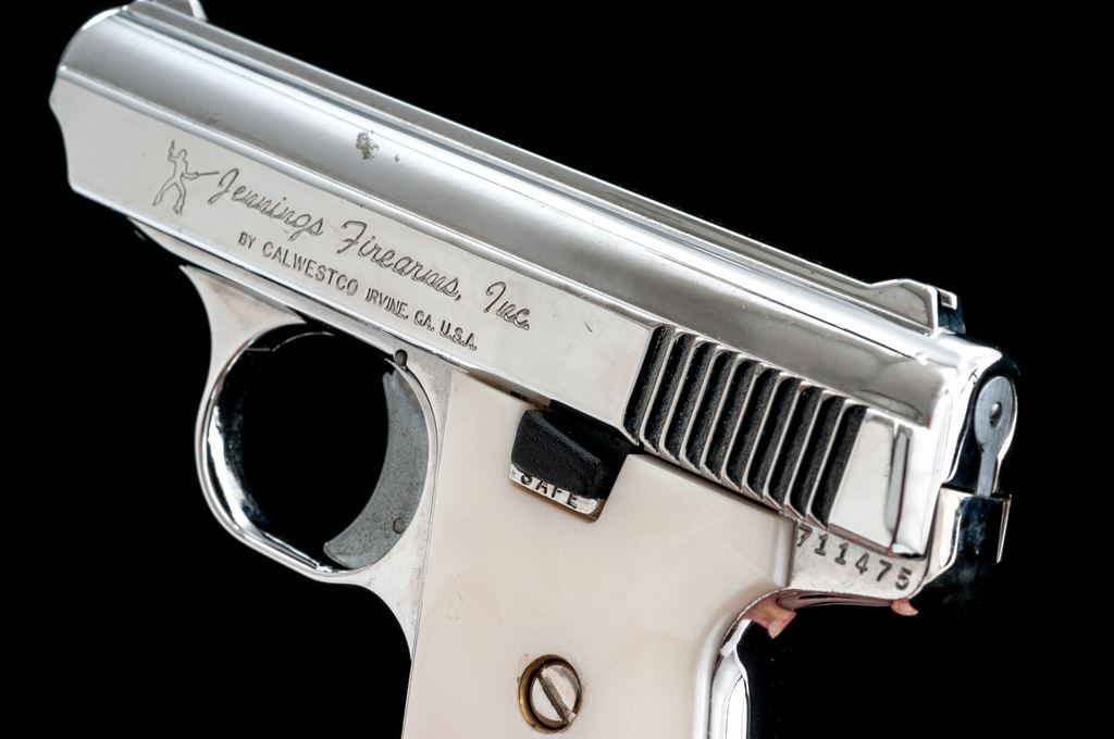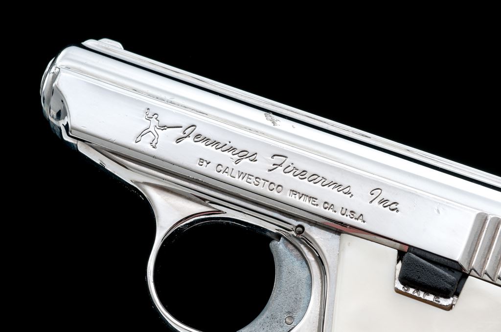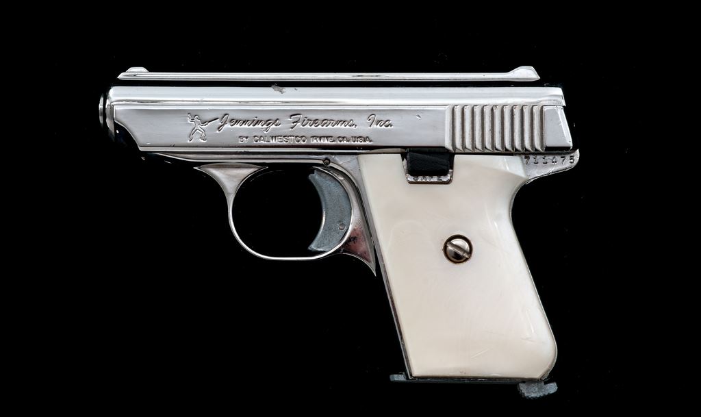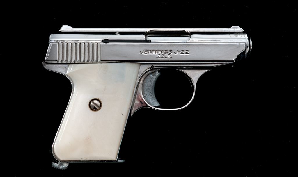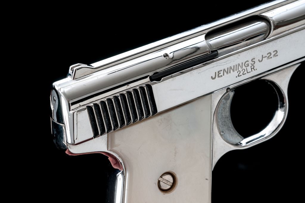 Jennings J-22 Semi-Automatic Pistol, #711475, .22 LR cal., 2.5'' barrel, chrome finish, with smooth white plastic grips and one magazine. Condition is very good+ with scattered light scratches and handling marks to the grips and metal. Smooth action, excellent bore. Est.: $75-$150. (Modern/PPT)