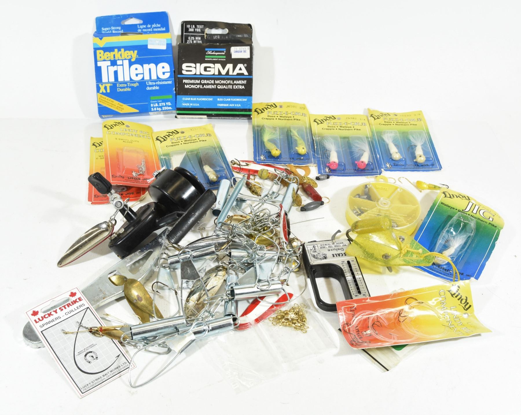 1) Vintage Mitchell 300 open face reel made in France in good condition. 2) Assortment of fishing tackle including line, lures, sinkers, swivels, hooks, stringer, scale and more.