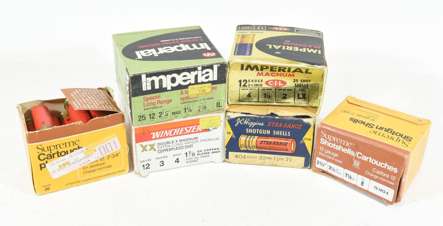5 rounds are paper slugs, 24 rounds are paper in a vintage J.C. Higgins box in fair condition and 21 rounds are 3" with showing some corrosion on the brass.