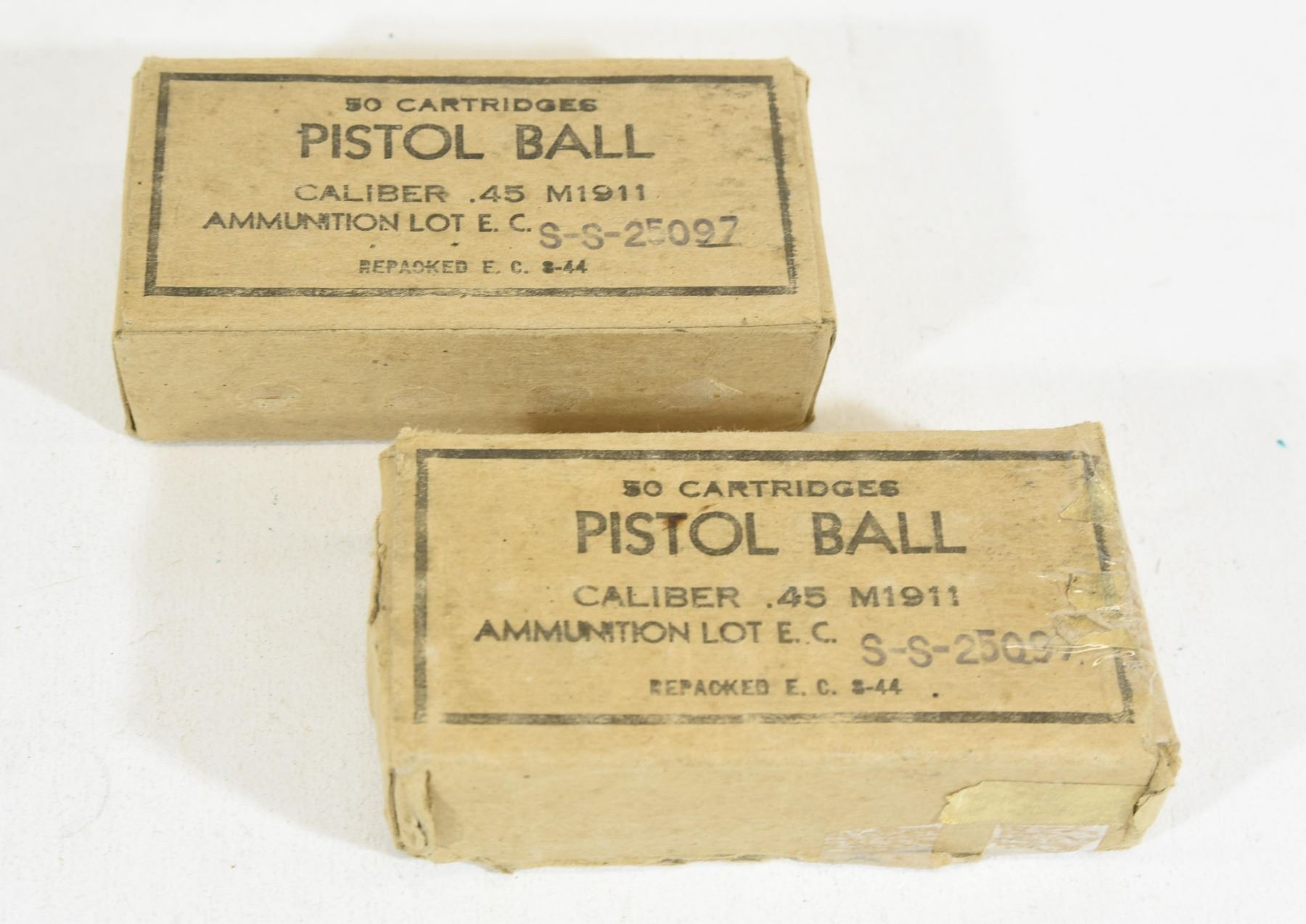 Vintage WWII ammo. Both boxes are marked ammunition lot E.C. S-S -25097, repacked E.C.S-44.