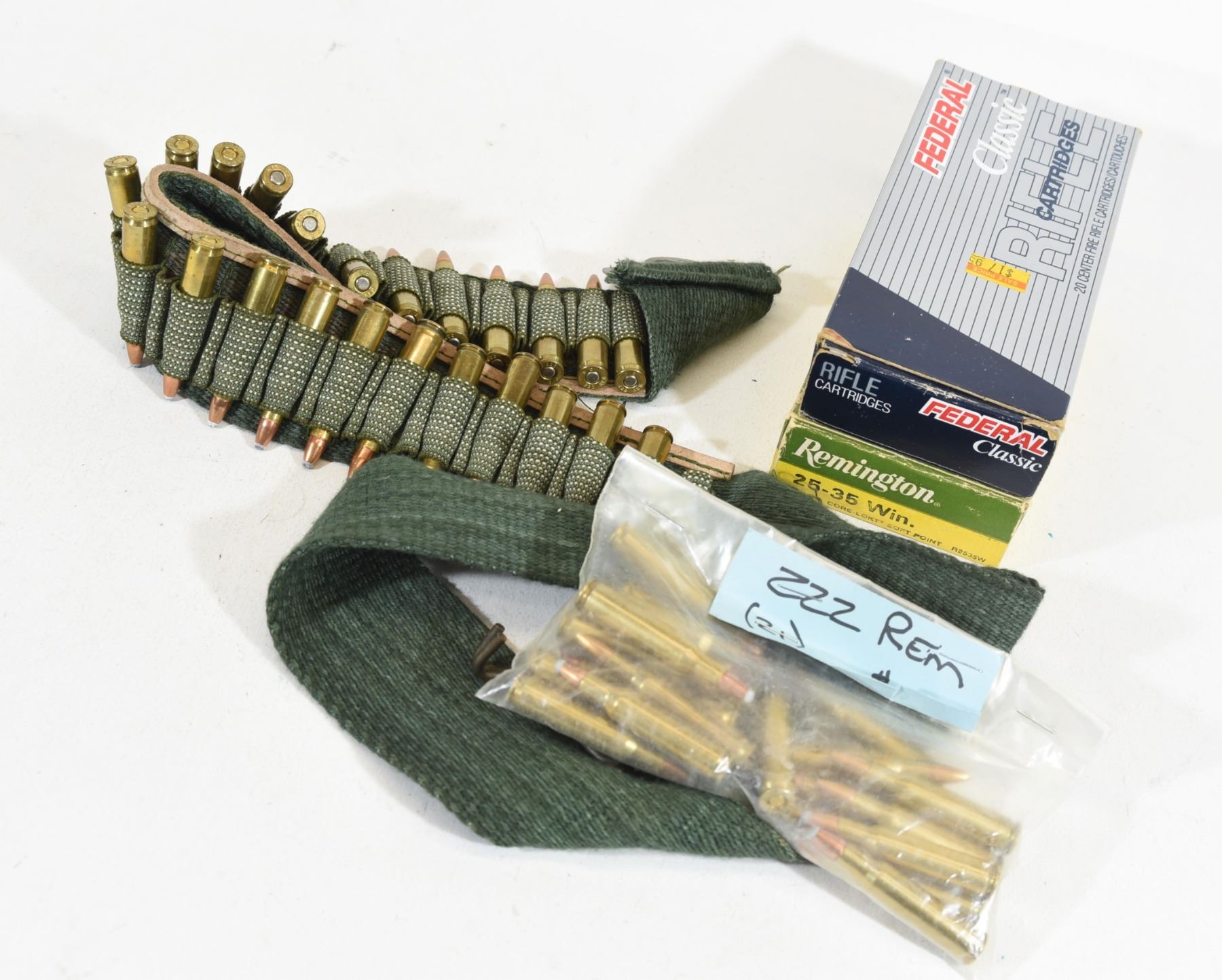 1) 20 rounds 25-35 Win. 117 gr. sp. 2) 14 rounds .32 Win. Special, 170 gr. sp. 3) 44 rounds 222 Rem. mixed manufacturers sp with cloth ammo belt.