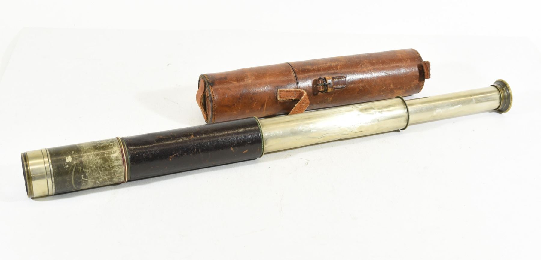 Ross of London No. 32014. Made out of leather and brass, it is 10 1/4" when closed and 23 1/2" when extended. The brass barrel has some dents. Comes with a leather case that is in fair condition.