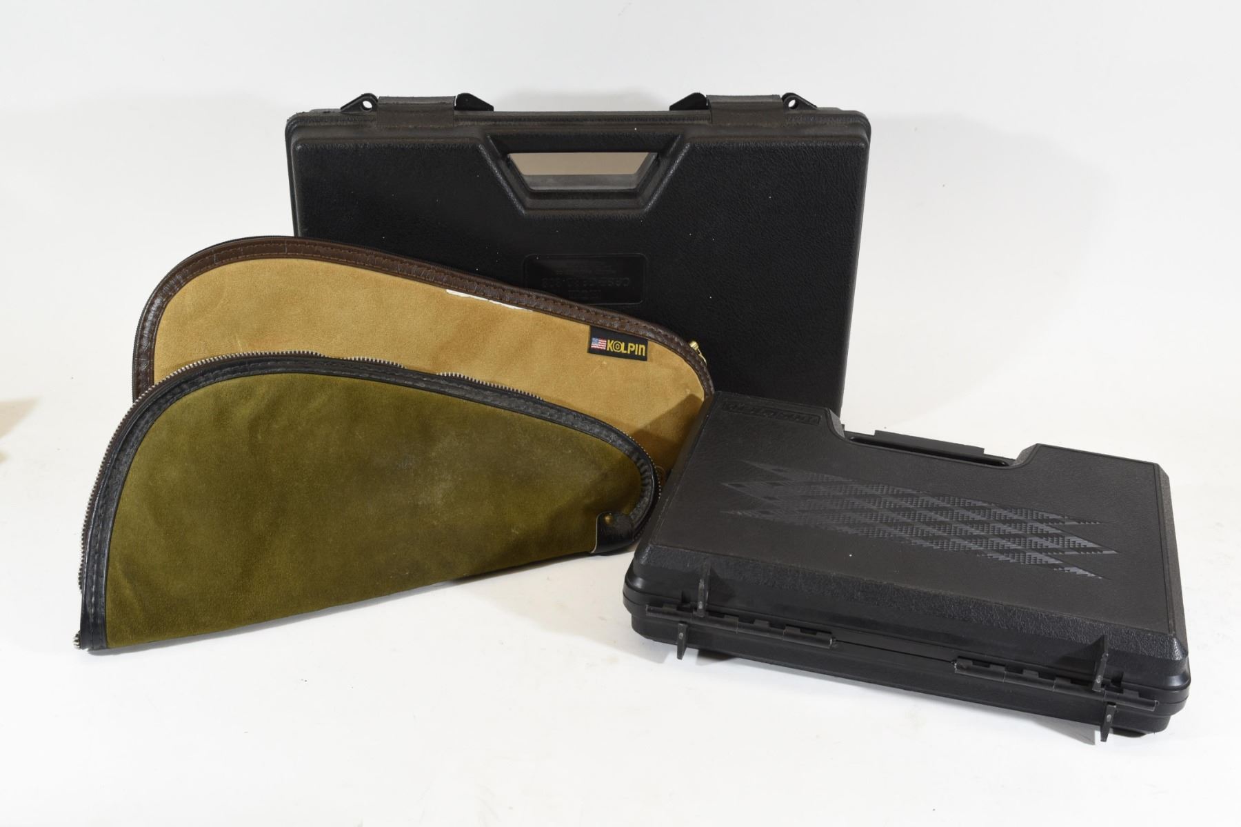 1) Kolpin soft case, lined, 14" long. 2) Redhead soft case, lined, 13" long. 3) MTM Case-Gard 808 hard case, 14" long x 8 1/2" wide. 4) Doskocil hard case, 11 1/2" long x 7 1/2" wide