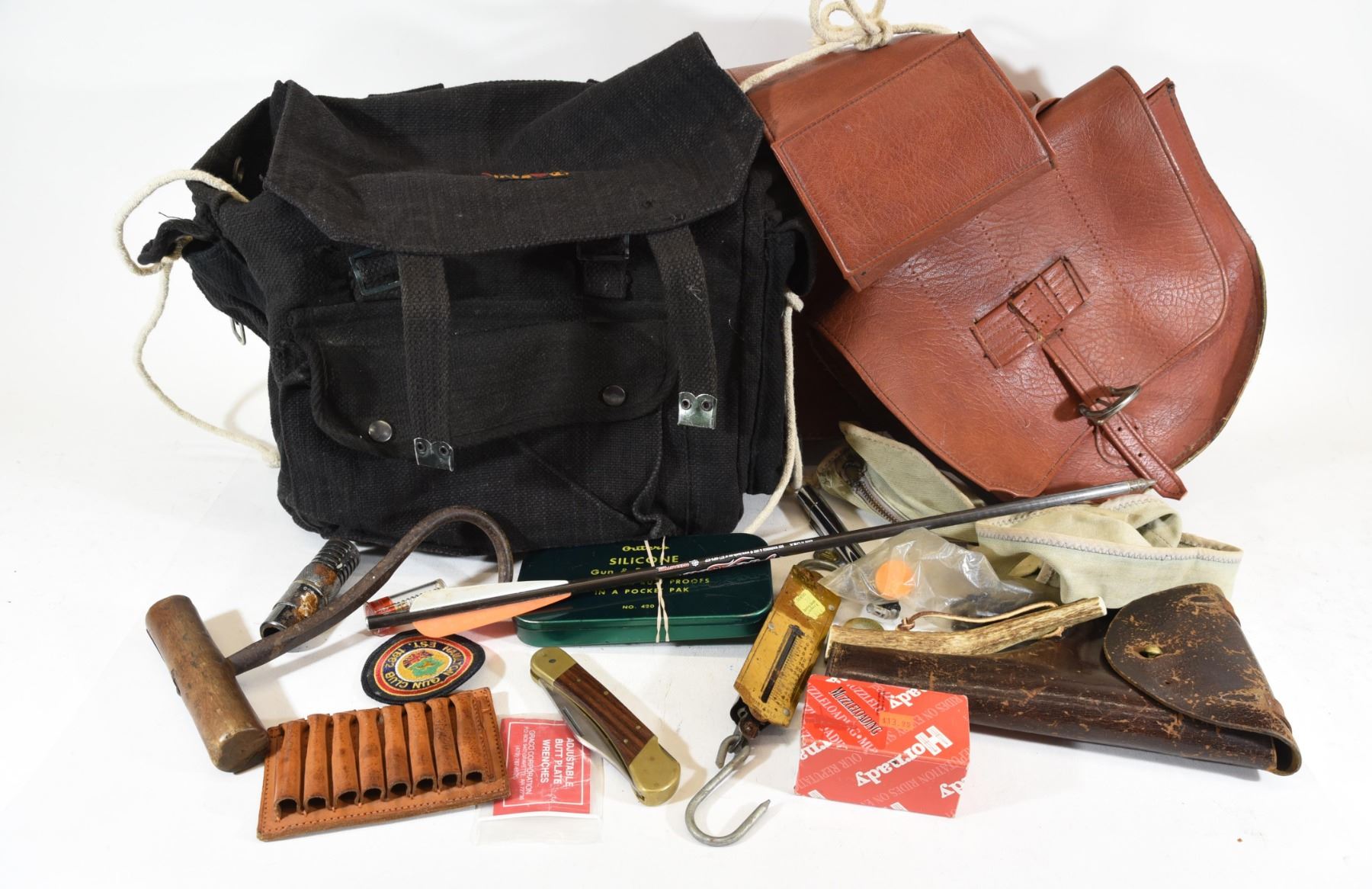 1) Antique hay bale hook; handle is badly cracked. 2) Vintage military style holster, showing wear. 3) Leather shell holder for 8 8 shells. 4) Vintage Outers silicone gun & reel cloth. 5) Bore light works but no batteries in it. 6) Vintage fish scale. 7) Piece of deer antler with lead inserted. 8) Folding lock blade knife, 3 1/2" blade. 9) Poly choke that has been cut off an unknown shotgun. Has rust and corrosion. 10) Peep sight with Lyman inserts. Unsure if complete. 11) 99 pieces. 44 cal. round ball.