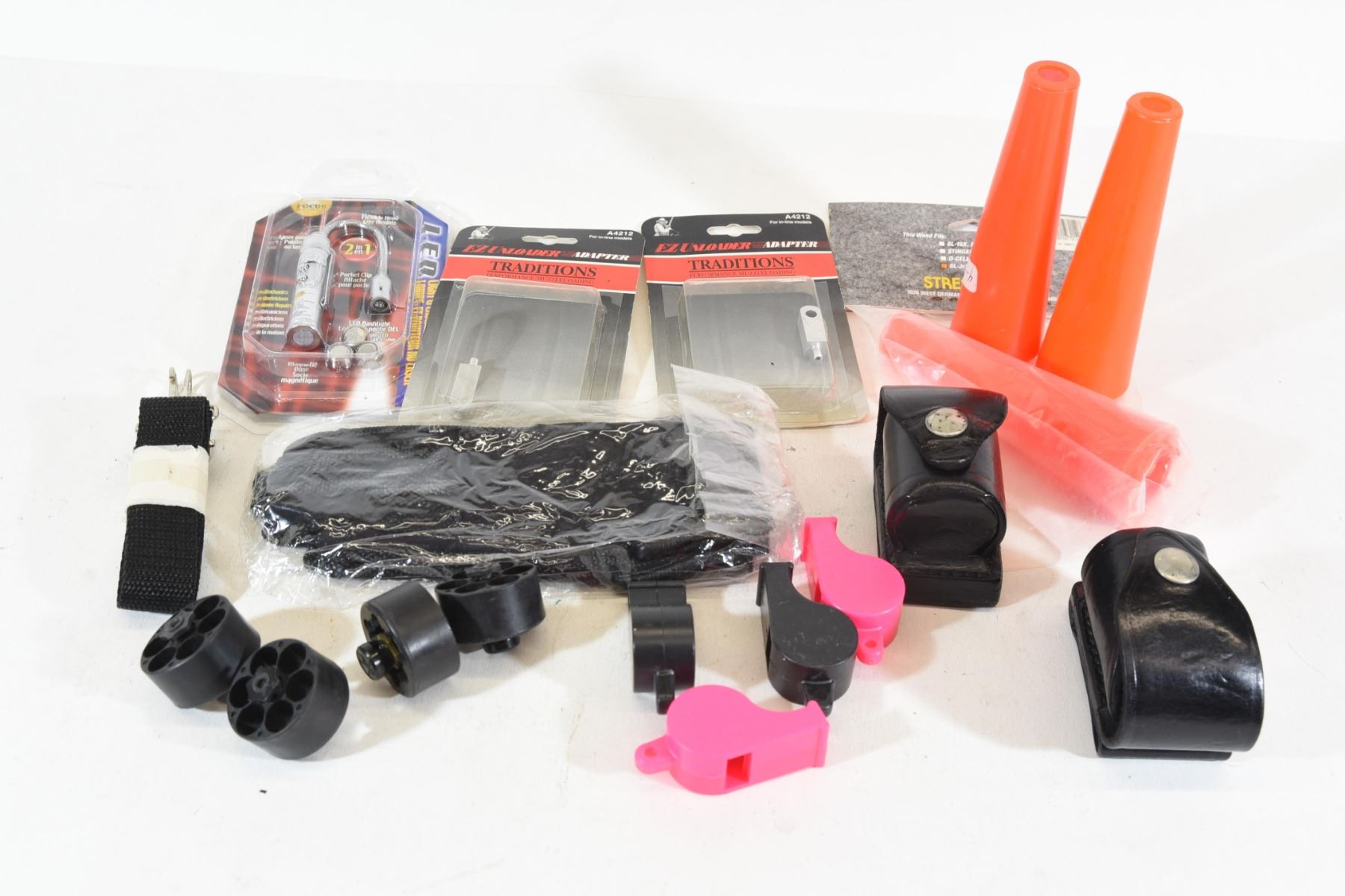 Three Streamlight traffic wands, two black & two pink whistles, four speed loaders and two pouches, two Traditions A4212 in line adapters, nylon strap, size small gloves, Focus Electronics LED light & laser pointer.