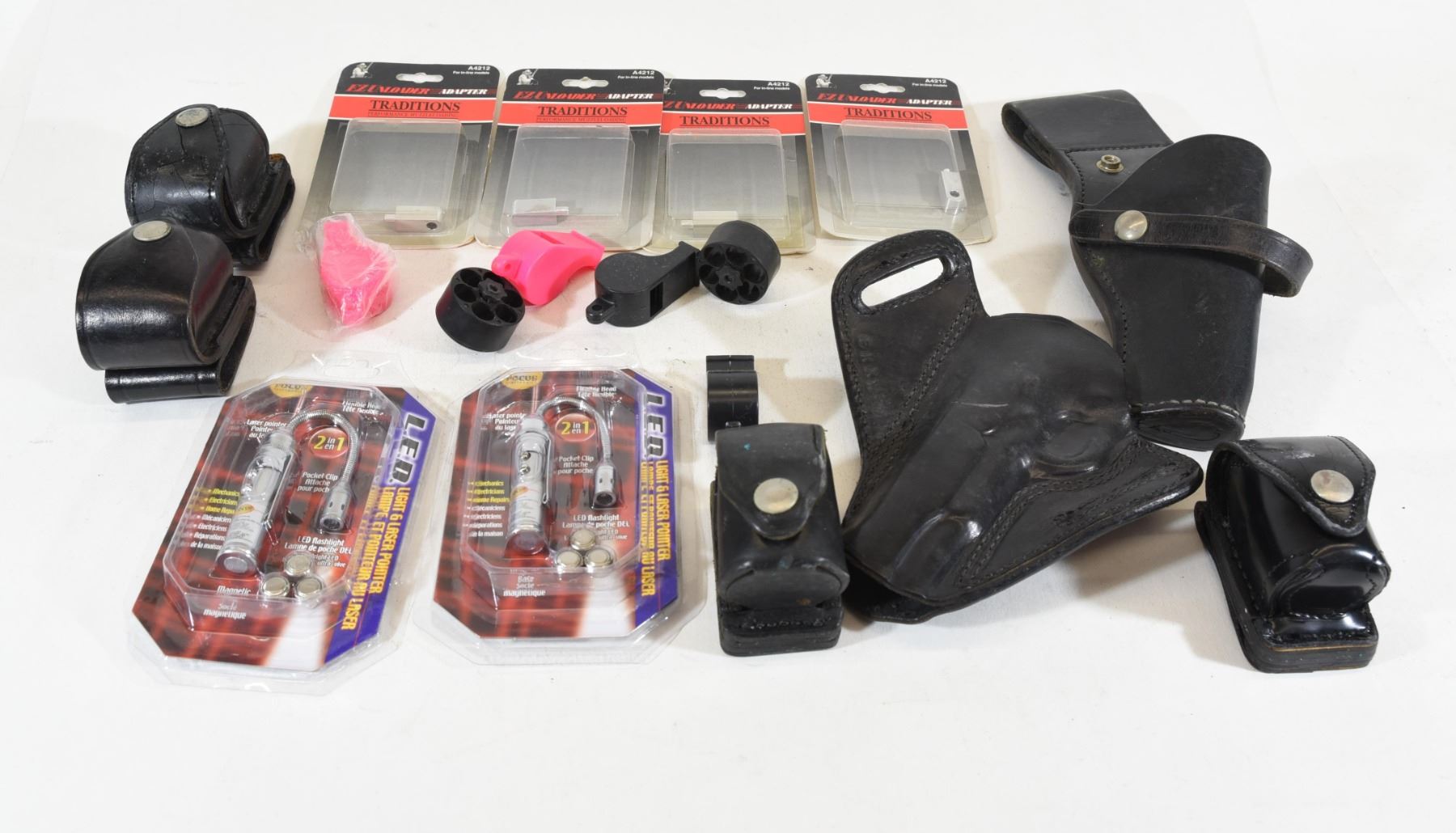 Four Traditions A4212 in line adapters, two Focus Electronics LED laser & light pointers, two pink & two black whistles, two holsters, two speed loaders and four pouches.