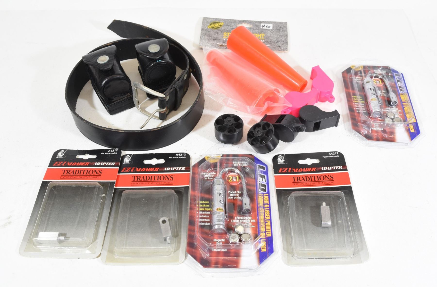 2 pink & 2 black plastic whistles, 2 speed loaders with leather holders, 29" leather belt, 2 Streamlight traffic wands, 2 Focus L.E.D. light and laser pointers, 3 Traditions EZ Unloaders A4212.