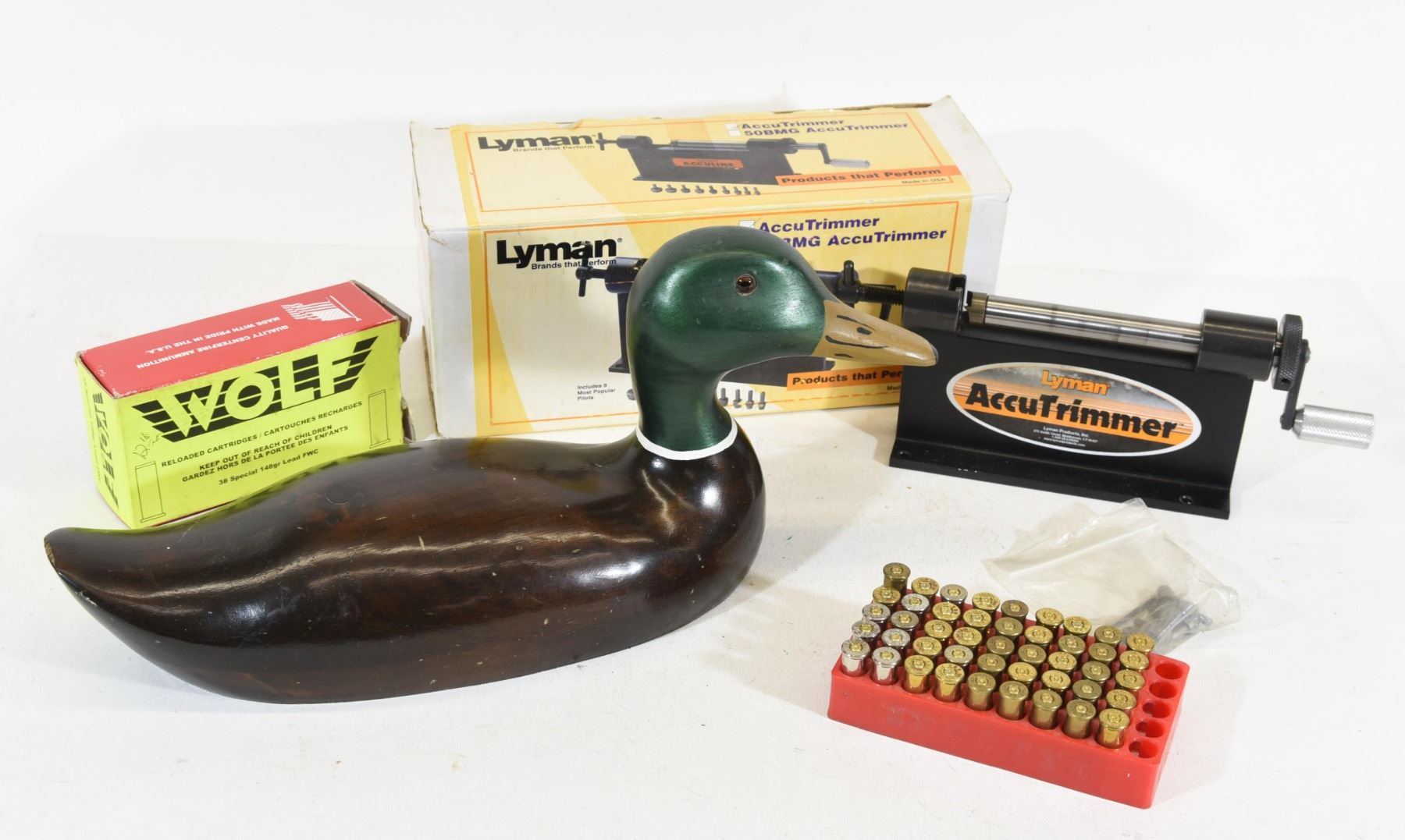 1) Mallard duck carving by W.A. Rack, Parry Sound, ON. 2) Lyman Accu trimmer. 3) 45 pieces 38 Spl brass.