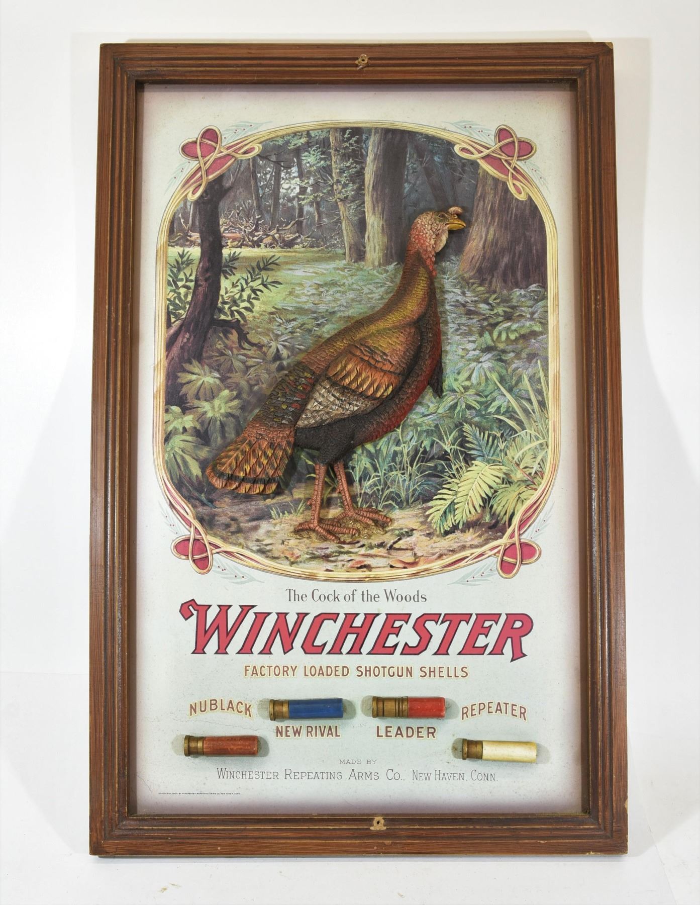 The Cock of the Woods, Winchester Shotgun Shell board in frame. Frame has screw holes in top and bottom. 27x17 inches in size.
