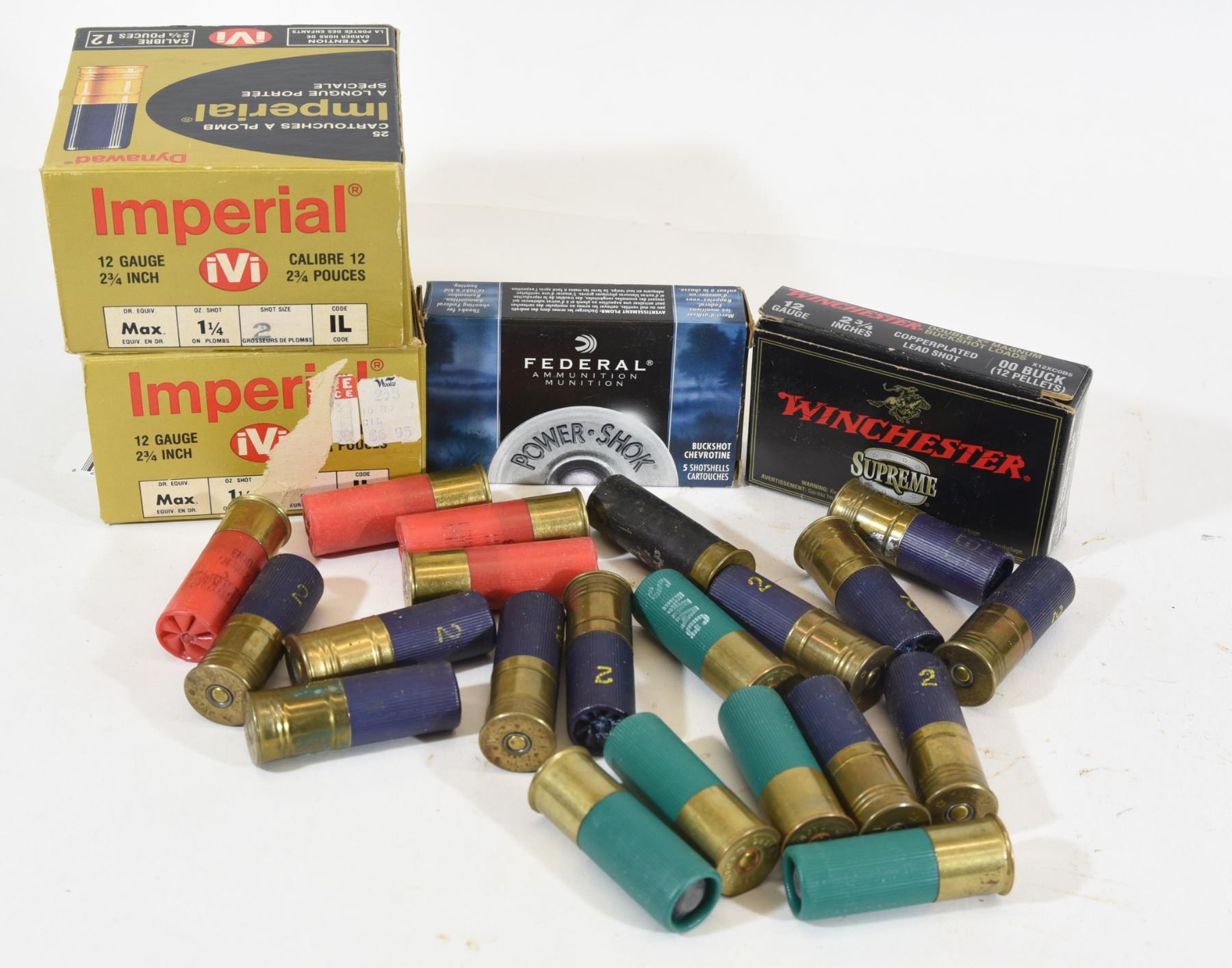 1) 50 rounds Imperial #2s. 2) 5 rounds Remington slugs. 3) 5 rounds Federal 00BK. 4) 5 rounds Winchester slugs. 16 rounds mix of Imperial and Winchester.