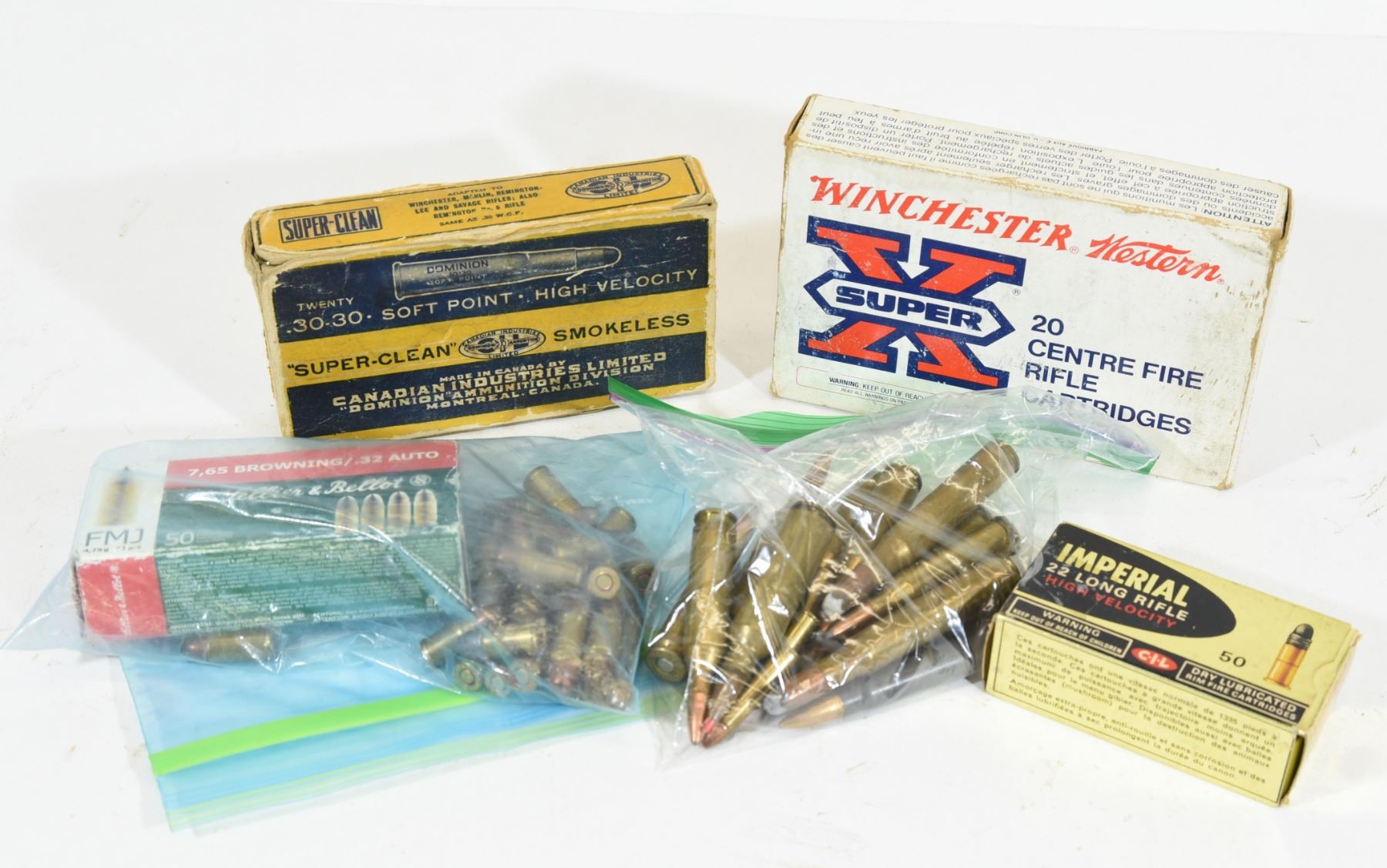 1) 20 rounds of 30-30 in vintage C-I-L box. 2) 6 rounds of 7mm Rem. mag. & 5 pieces of brass. 3) 6 rounds of 243 Win. 4) 4 rounds of 30-06 Sprg. 5) 50 rounds of 22 lr 6) 7 rounds of 22 magnum 7) 79 rounds of 32 auto 8) 1 round 270, 1 round 7.62 x 39