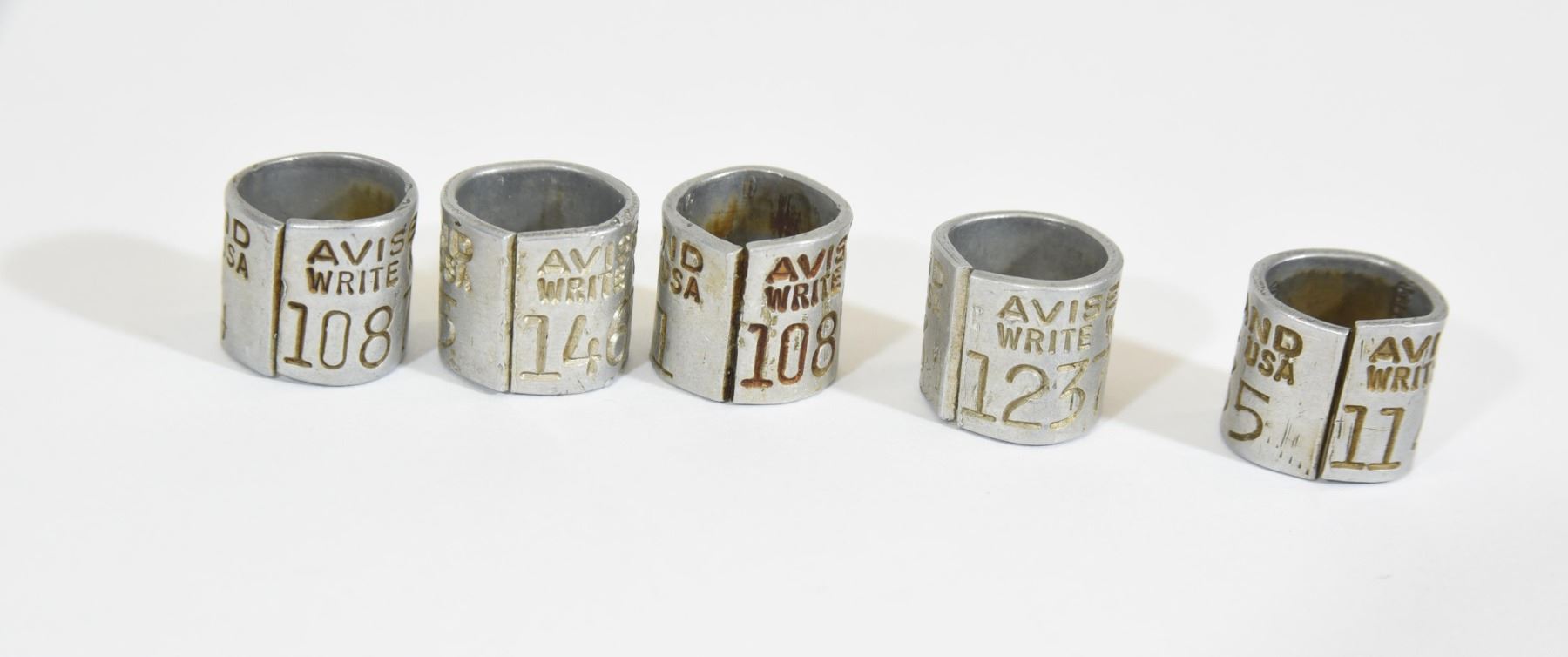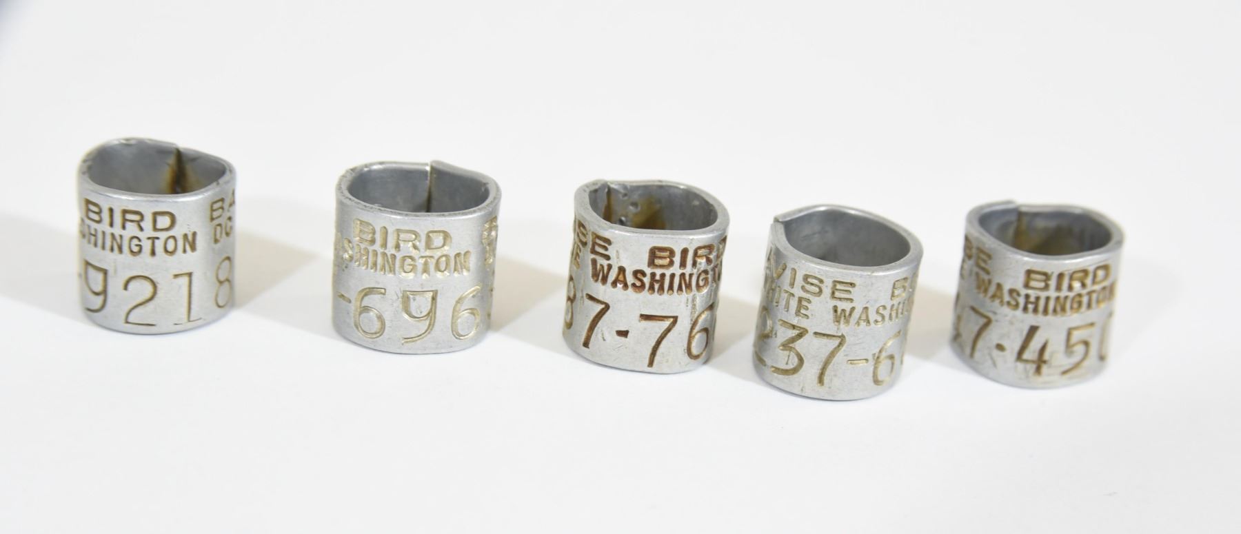 1) Avise bird band, Write Washington DC USA, 1087-76611. 2) Avise bird band, Write Washington DC USA, 1147-45035. 3) Avise bird band, Write Washington DC USA, 1237-68113. 4) Avise bird band, Write Washington DC USA, 1467-69685. 5) Avise bird band, Write Washington DC USA, 1087-92184.