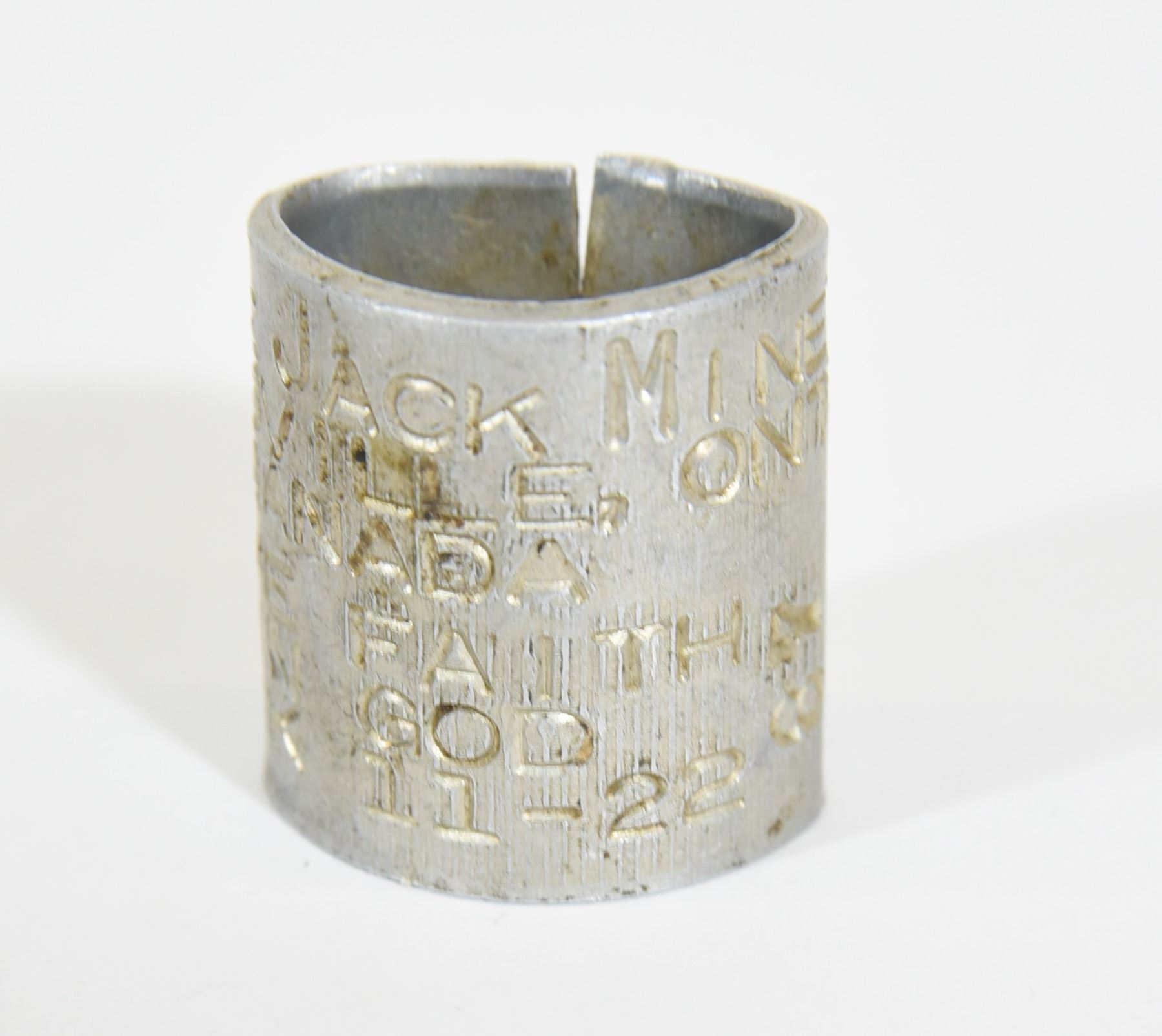 Writer Jack Miner, Kingsville, Ontario: Have Faith In God, Mark 11-22, 87, 86766. Jack Miner banded his first Canada goose in 1915 to help track migration and later started adding Bible verses. The aluminum bands have become collectibles.