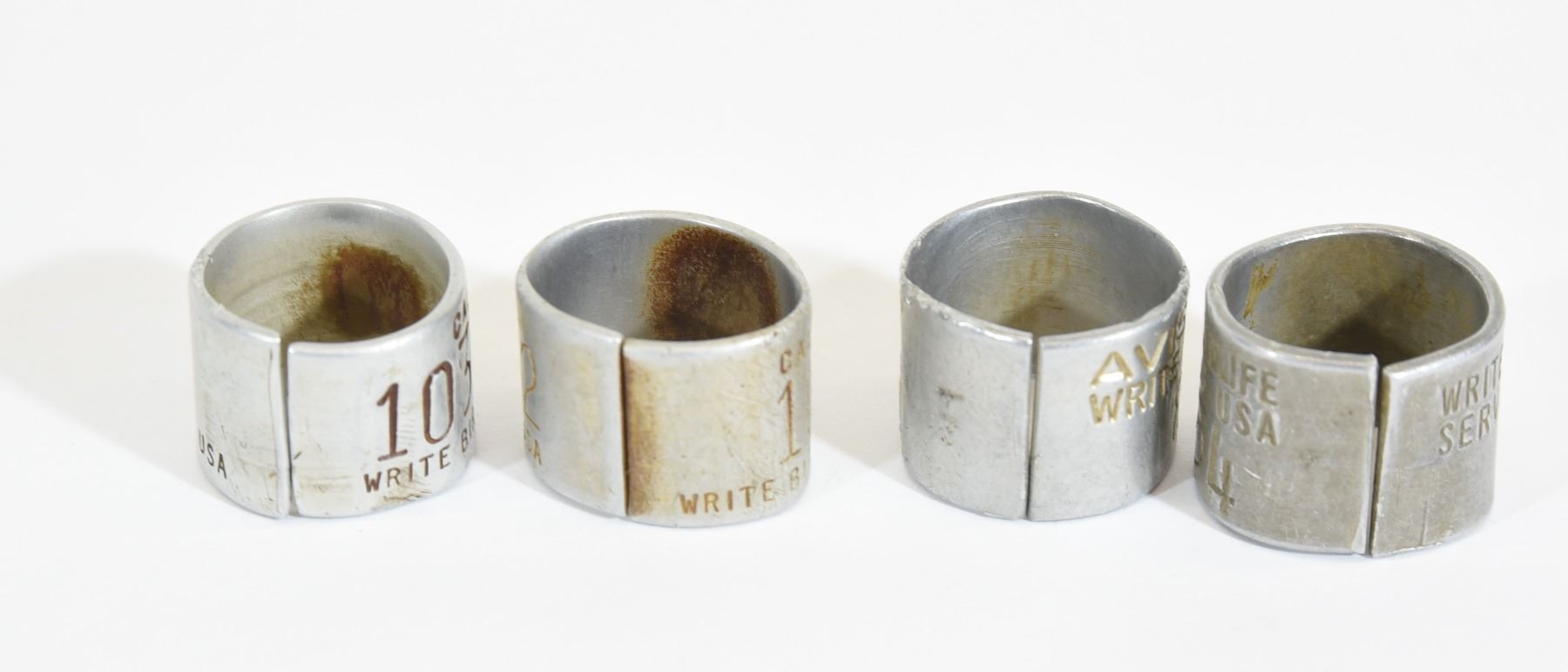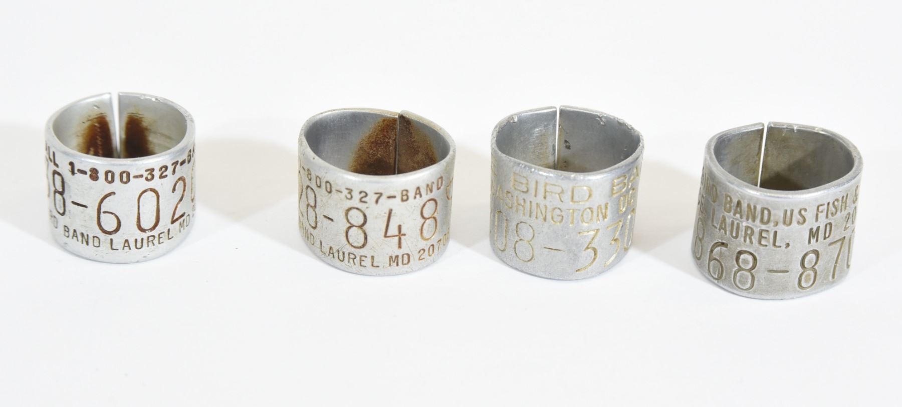 1) Avise Bird Band, Write Washington DC USA, 808-33061. 2) Call 1-800-327-BAND, 1038-60204, Write Bird Band Laurel MD 20708 USA. 3) Call 1-800-327-BAND, 1028-84892, Write Bird Band Laurel MD 20708 USA. 4) Write Bird Band, US Fish & Wildlife Service, Laurel, MD20708 USA, 868-87054.