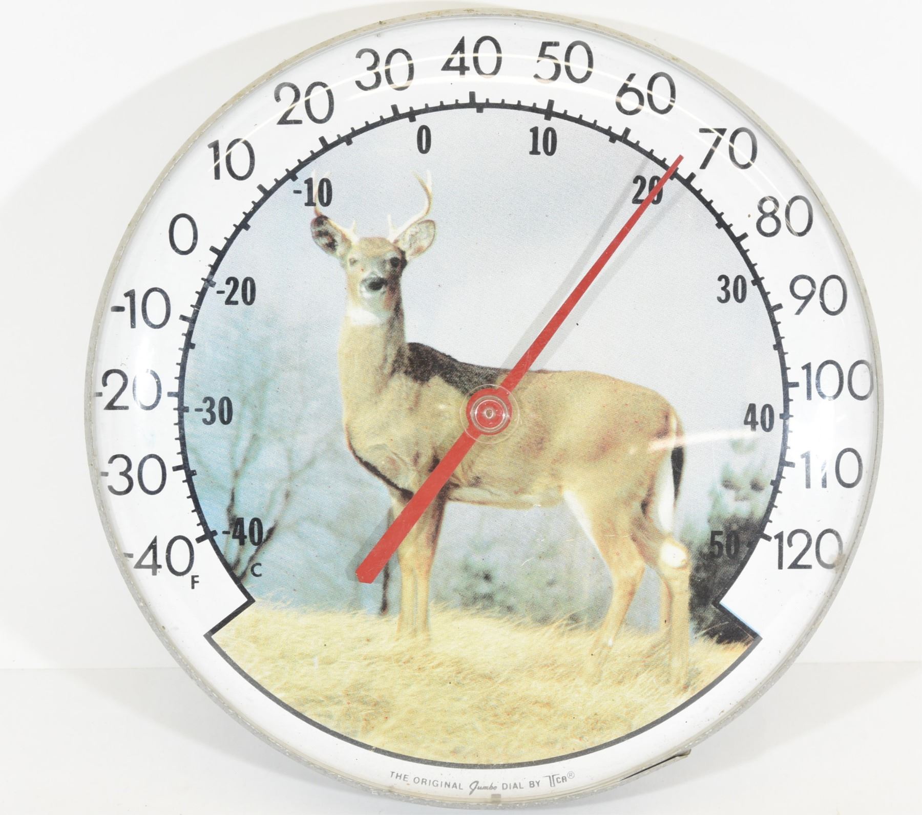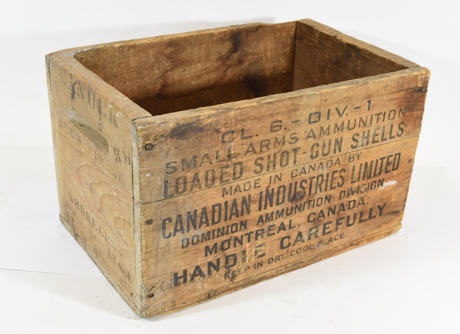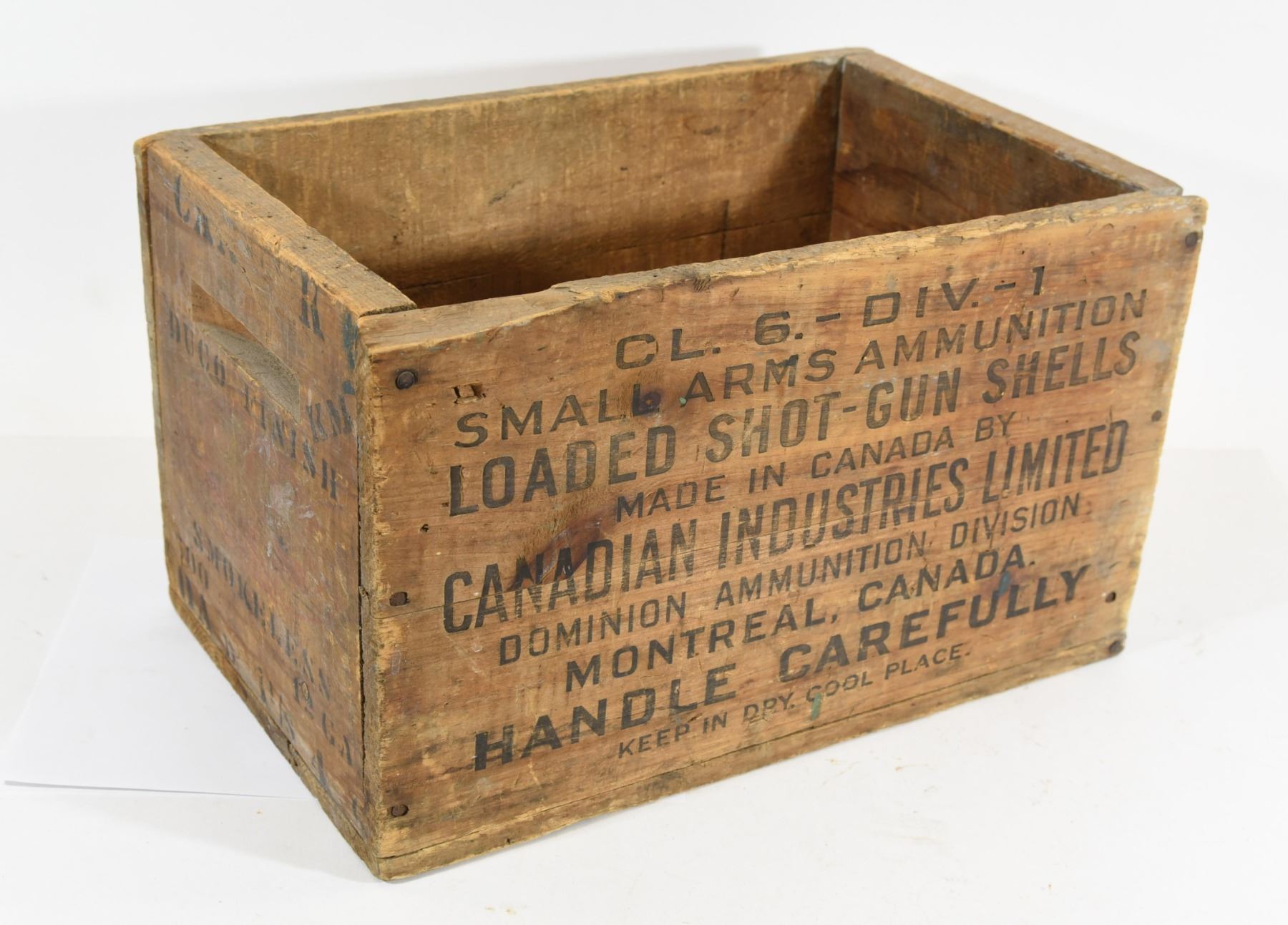 Has CL. 6. - Div. - 1, Small Arms Ammunition, Loaded Shot-Gun Shells, Made In Canada By Canadian Industries Limited, Dominion Ammunition Division, Montreal, Canada. Handle Carefully, Keep In Dry Cool Place on the front & back. Outside dimensions are roughly 15" x 9 1/2" x 9". No lid. Has some dents and scratches and a chip out of top board on left hand side. Comes with a outdoor whitetail deer thermometer.