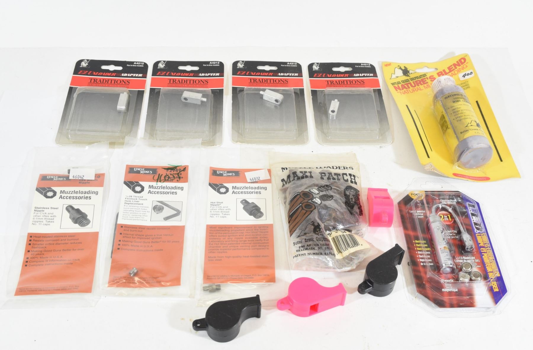 Natures Blend bore cleaner, 4 whistles, Focus Electronics LED light & laser pointer, 4 Traditions A4212 in-line adapters, 2 Uncle Mike's nipples and one touch hole adapter, package 54 cal maxi patch.