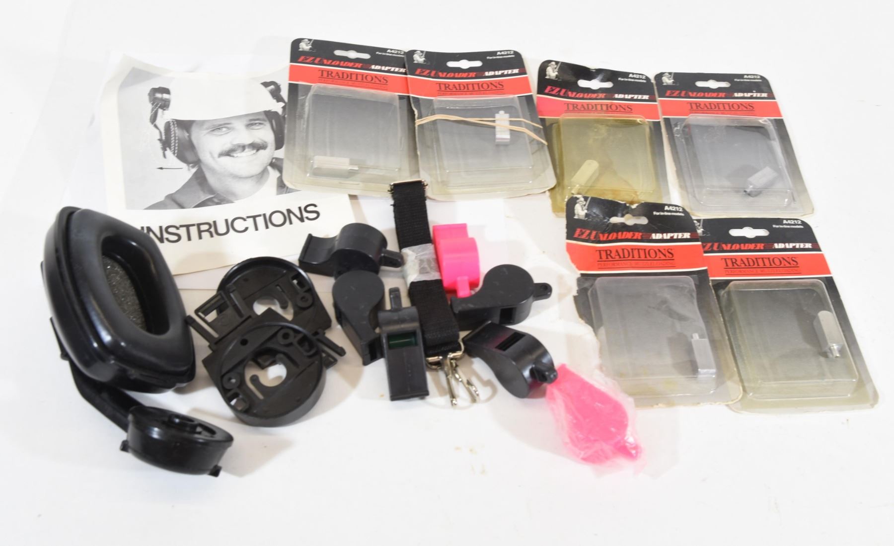 7 whistles, nylon carry strap, 6 Traditions A4212 adapters, 1 Bilson hearing protection for hard hat.