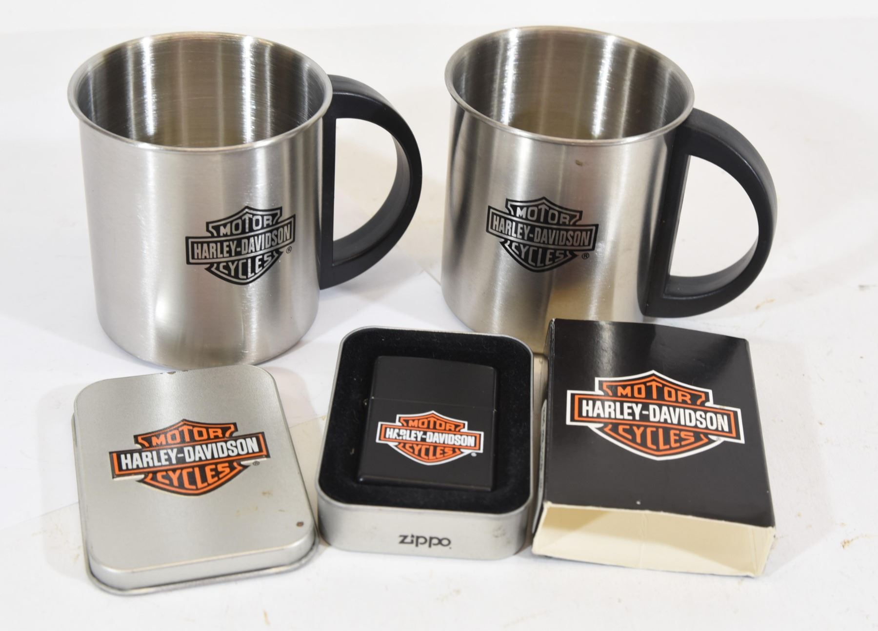 1) Lightly used Harley Davidson Zippo lighter in original tin with original cardboard sleeve. Lighter has a little missing paint on lettering. 2) 2 small metal Harley Davidson mugs.