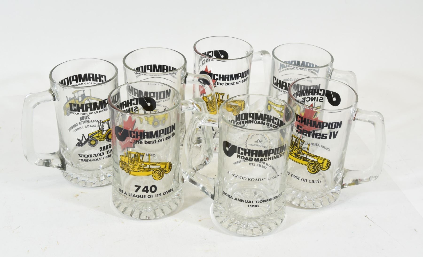 Seven Champion Road Grader mugs: 1) Series IV, year 1995. 2) Model 740, year 1996, 2 mugs. 3) 50th anniversary, year 1998. 4) Model G740B, year 2005. 5) Volvo Motor Graders, 2007. 6) Volvo Backhoe, year 2008.