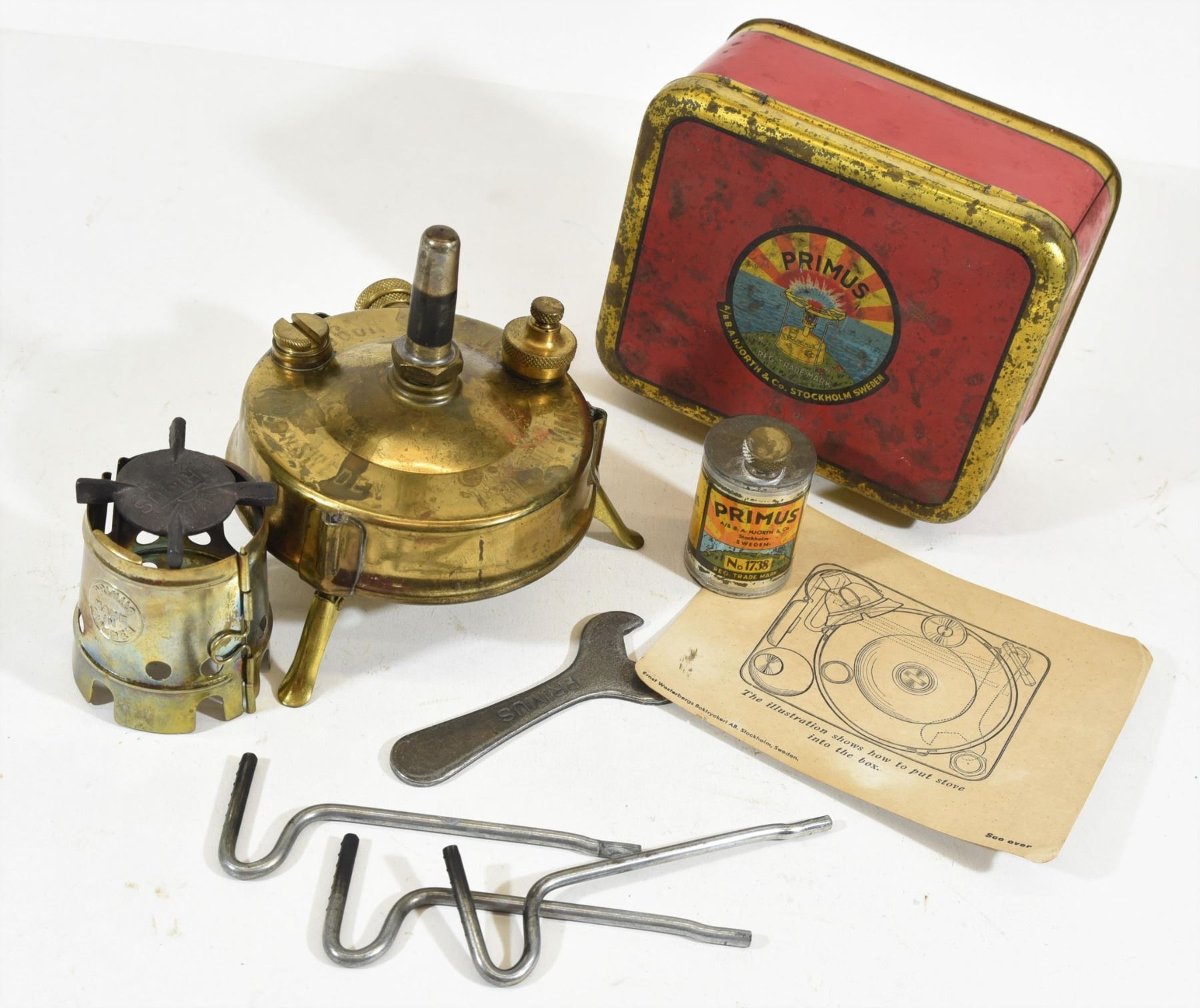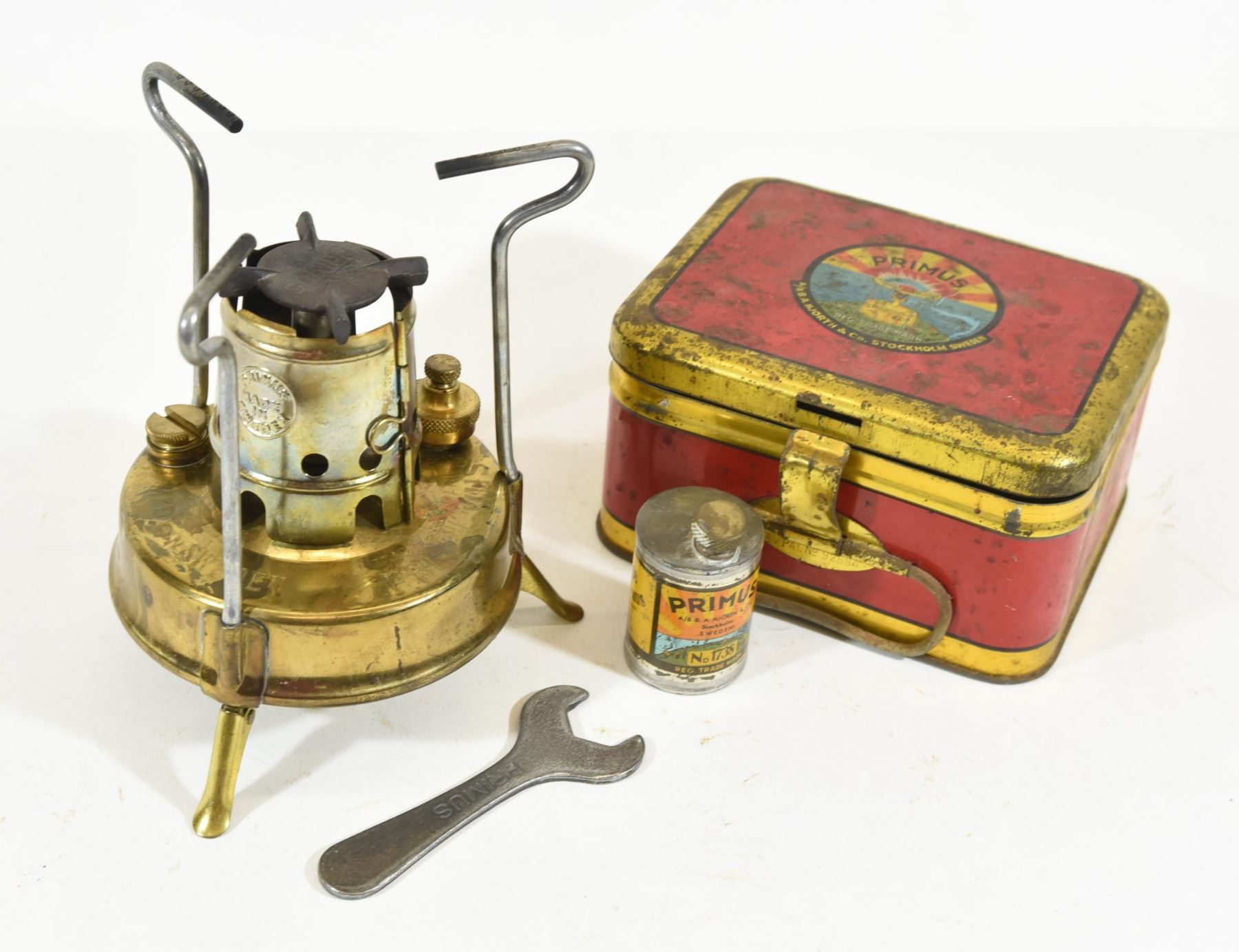 Made by B.A. Hjorth & Co. in Stockholm Sweden. Manufactured in 1953. Missing the burner bell. Good condition. Comes with original directions. Brass is somewhat tarnished and the storage tin is in good condition, but has some rust.