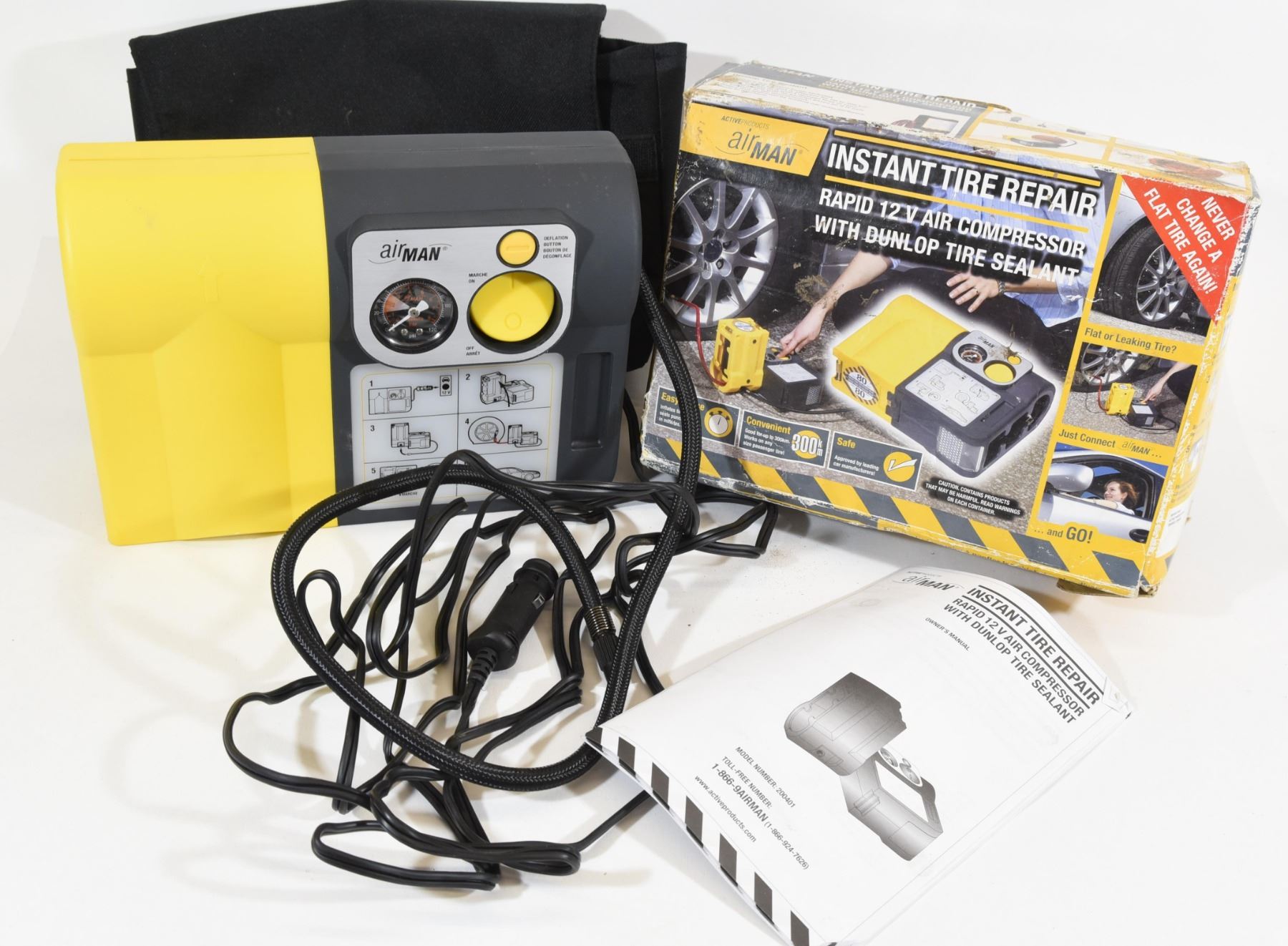 Rapid 12-volt air compressor with Dunlop tire sealant. Has manual. Unknown functionality.