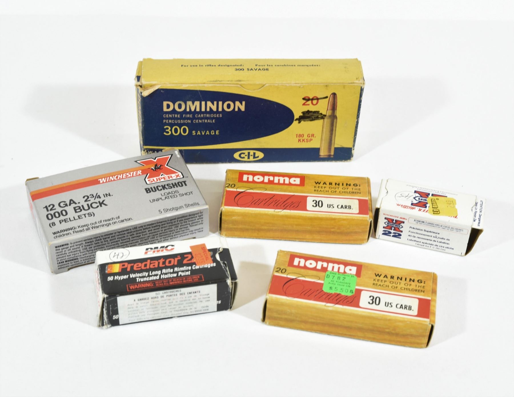 45 rounds Winchester Western 22 LR, 42 rounds PMC 22 LR, 40 rounds Norma 30 carbine, 5 rounds Winchester 12 Ga x 2 3/4" 000BK, 4 rounds Dominion 330 Savage in vintage box.