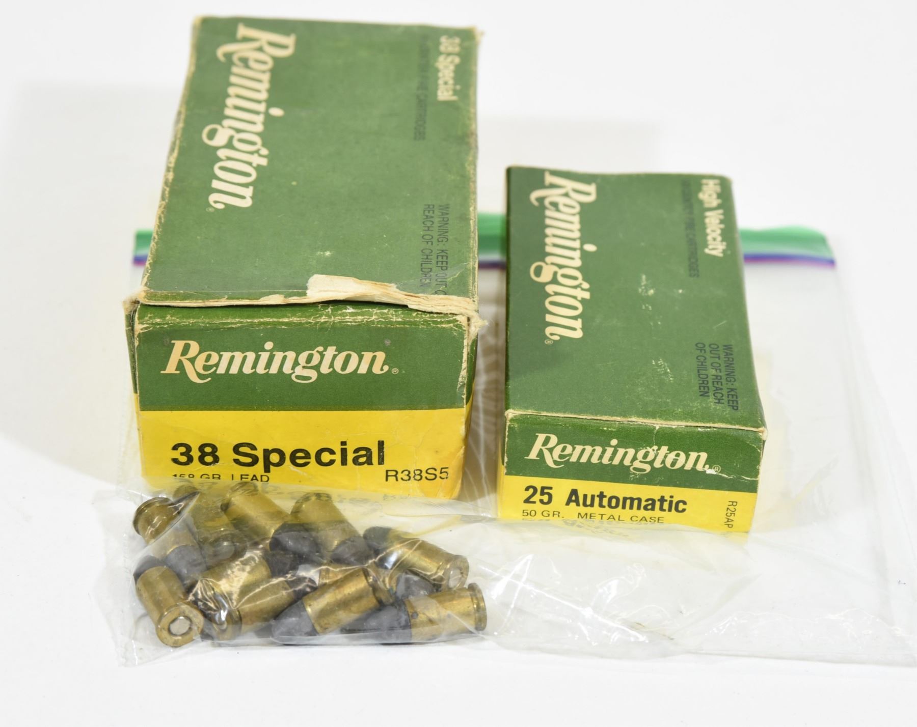 1) 10 rounds of 32 S&W. 2) 30 rounds of 25 Automatic 50 grain, metal case. 3) 46 rounds of 38 Special, 158 grain.