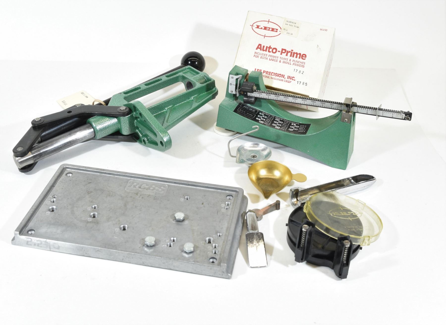 RCBS partner single stage loader with bench mount and one shell holder, in very good condition, RCBS 5-0-5 scale in very good condition. Lee auto primer also in very good condition.