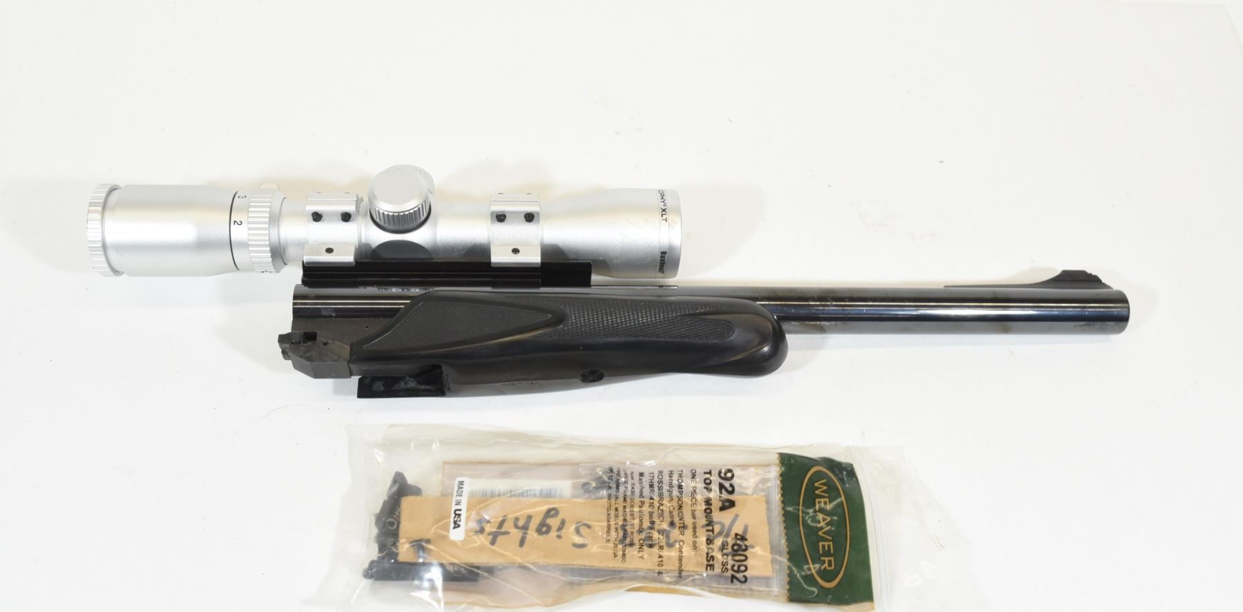 Super 14 barrel and forearm with Bushnell Trophy XLT 2-6 x 32 scope. Comes with original TC rear sights. Bluing has a couple of scratches and marks, bore excellent.