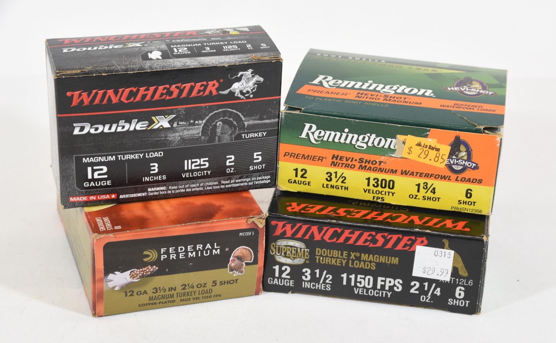 1) 10 rounds Winchester double x 3" #5 shot size. 2) 5 rounds Winchester double x magnum 3 1/2" #6 shot size. 3) 9 rounds Federal premium 3 1/2" #5 shot size copper. plated 4) 8 rounds mixed makes 3 1/2" #5 shot size.